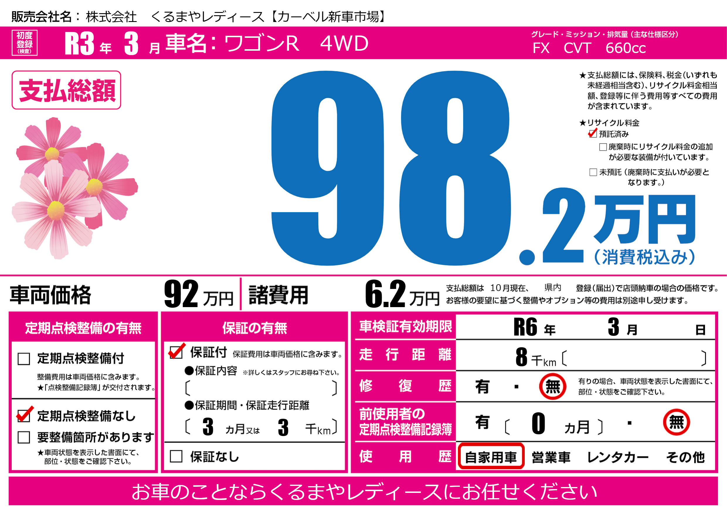 | 車名 | ワゴンR 4WD | グレード ミッション 排気量 |
