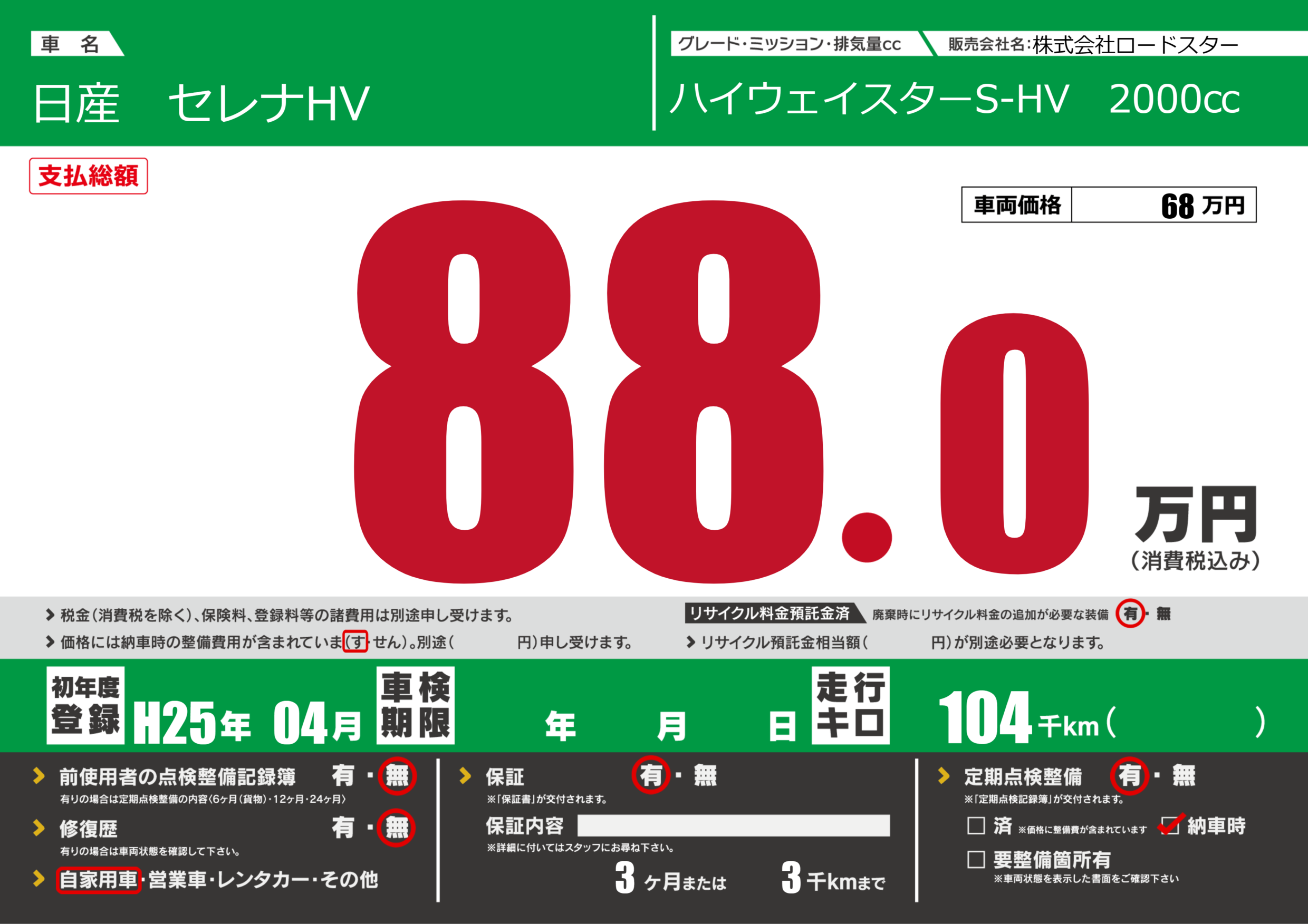 | 定期点検整備 | 定期点検整備あり 納車時あり | ||