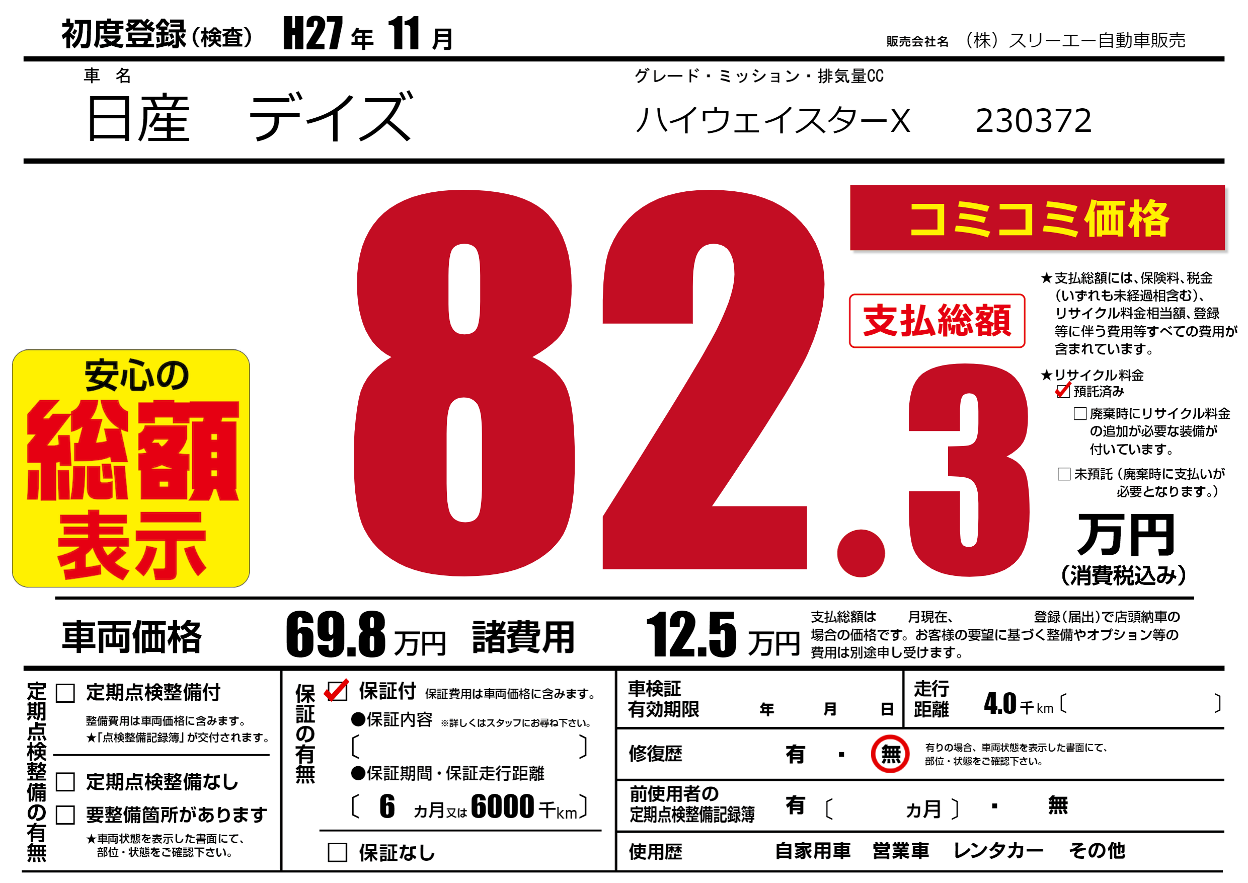 | 車名 | 日産 デイズ | グレード ミッション 排気量 |