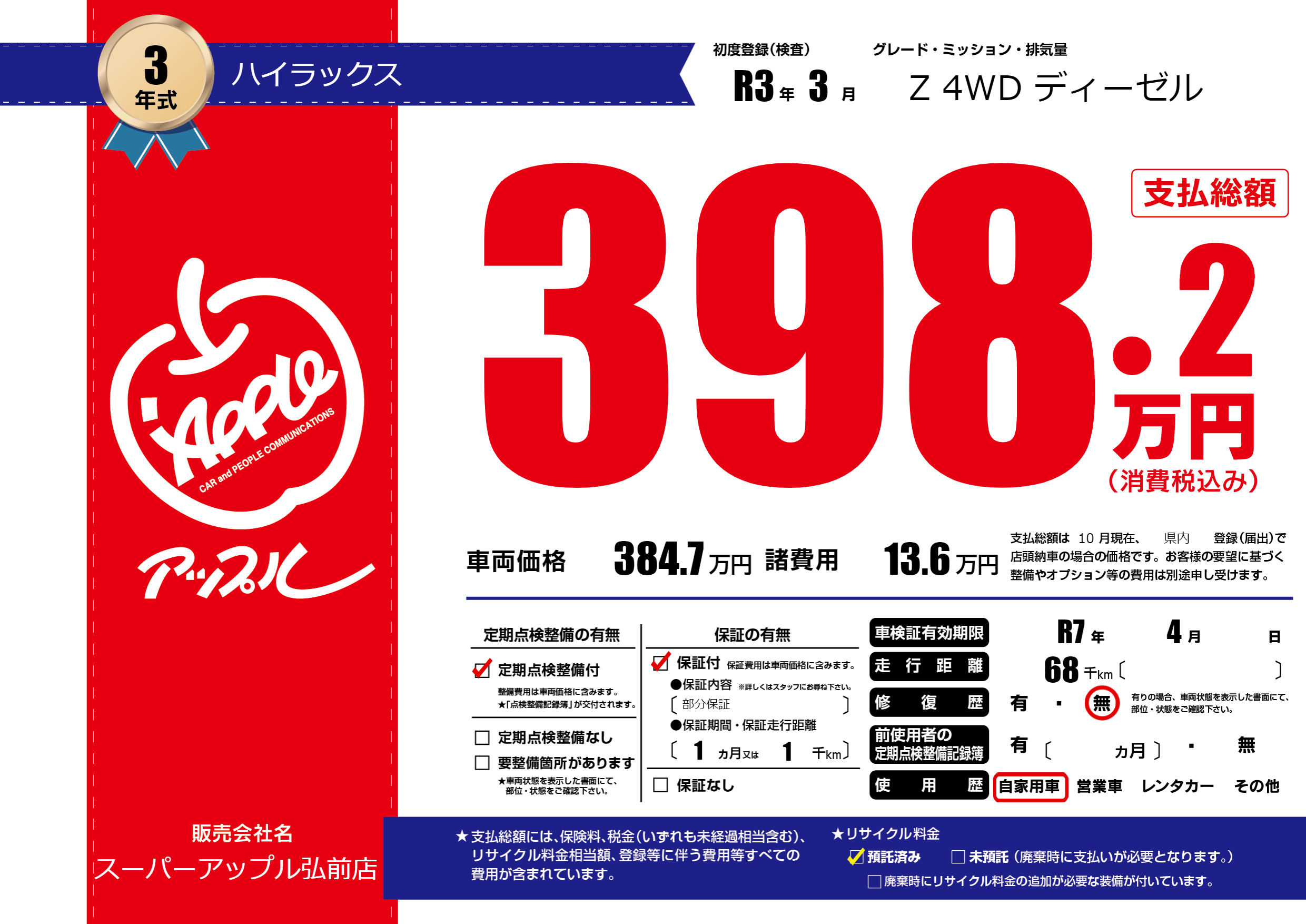 | 走行キロ | 6.8万km | 初年度登録 | R3年3月 |