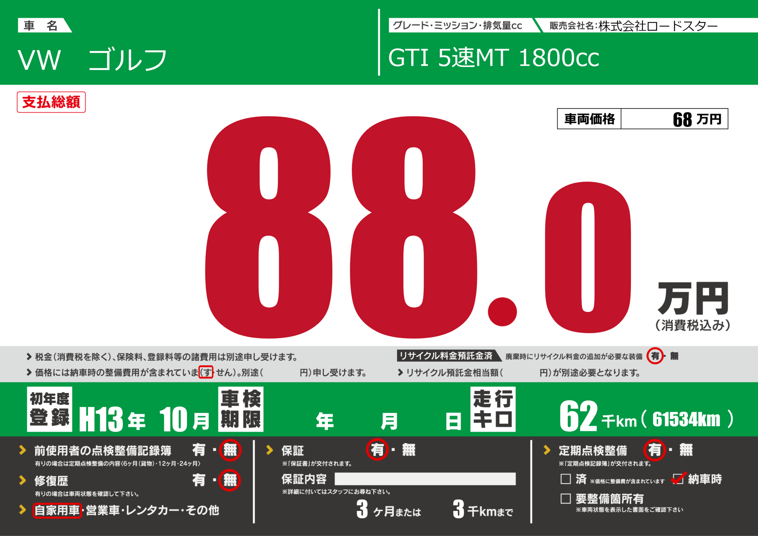 | 車名 | VW ゴルフ | グレード ミッション 排気量 |