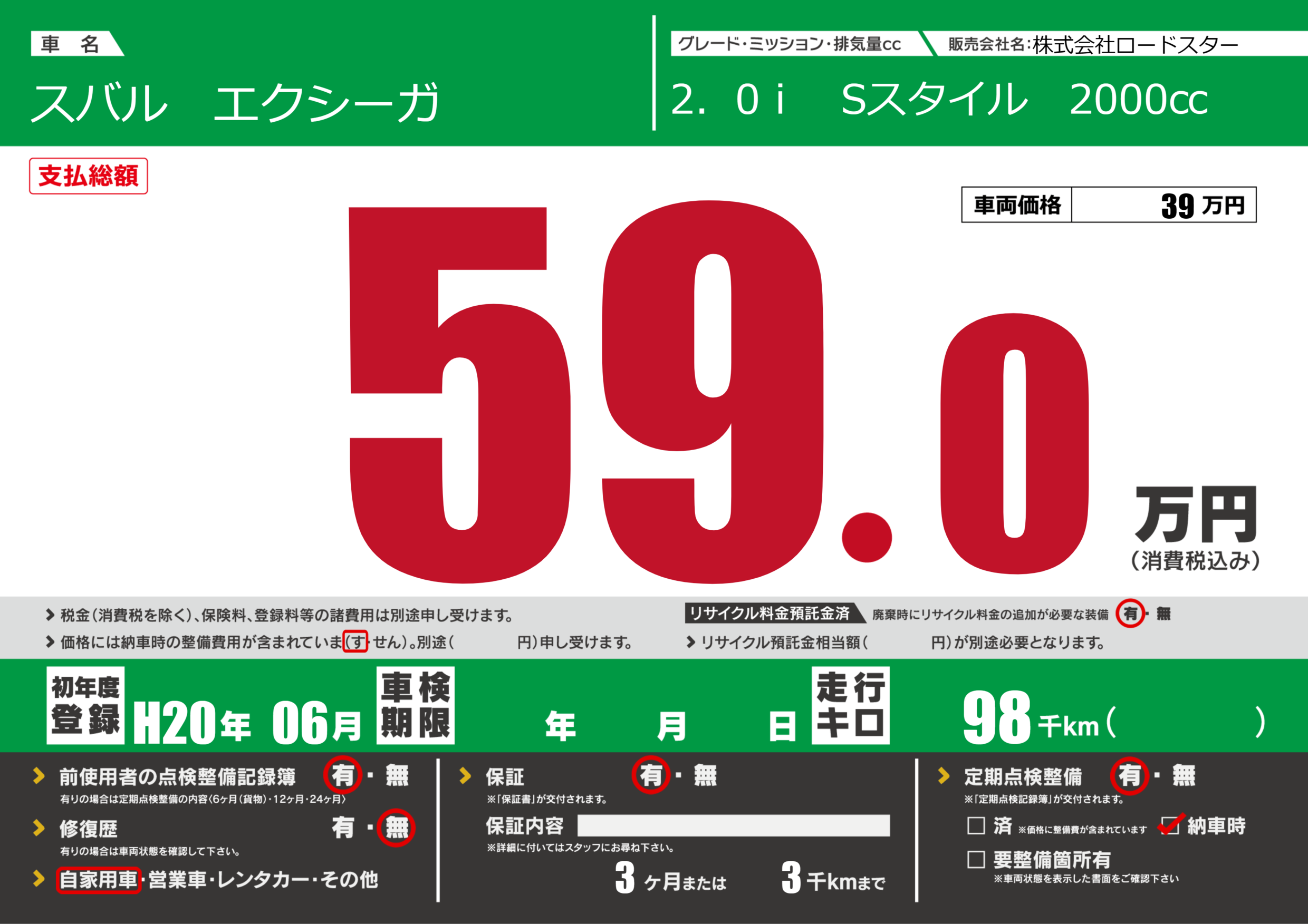 | 走行キロ | 9.8万km | 初年度登録 | H20年06月 |