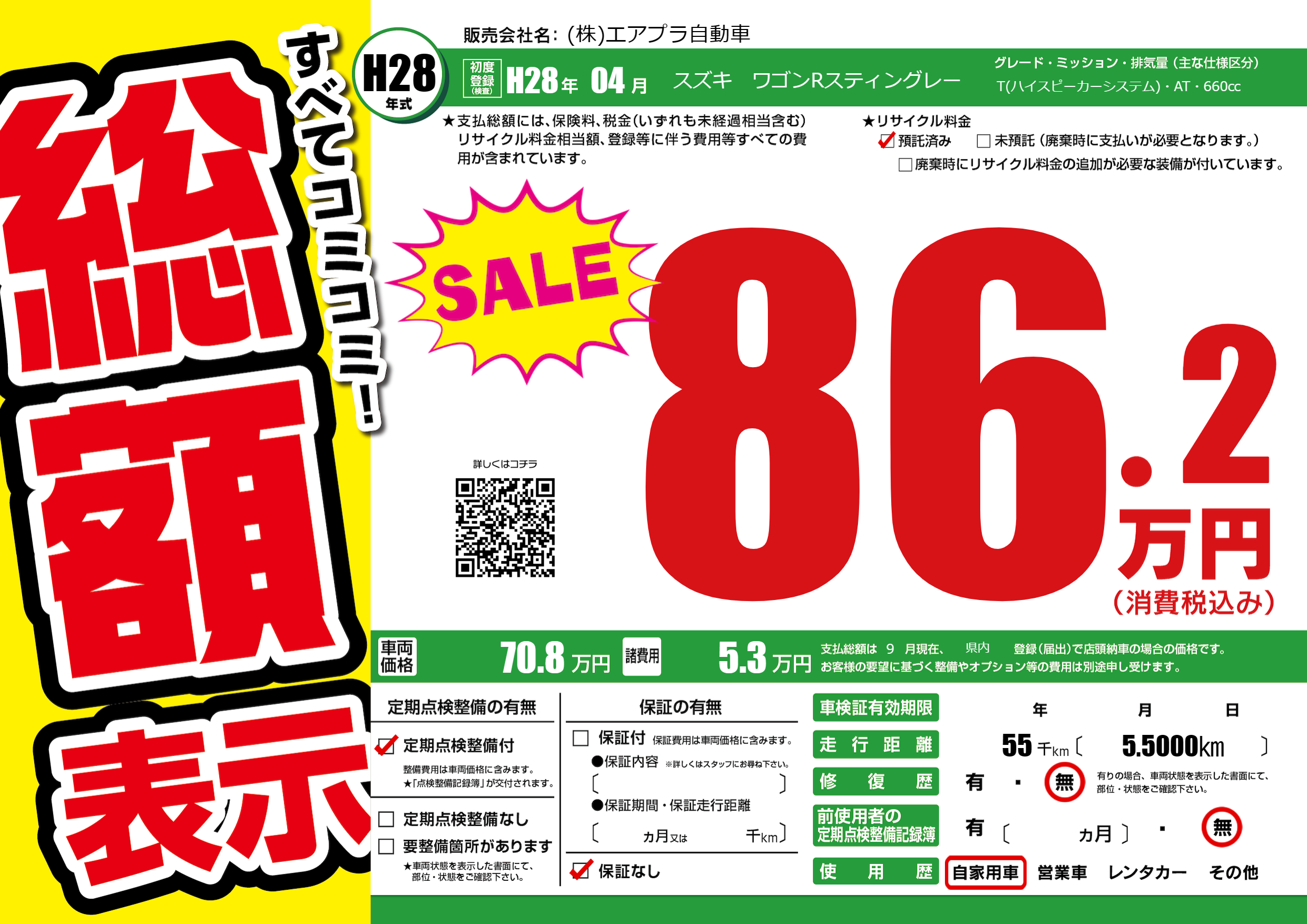 | 走行キロ | 5.5万km | 初年度登録 | H28年04月 |