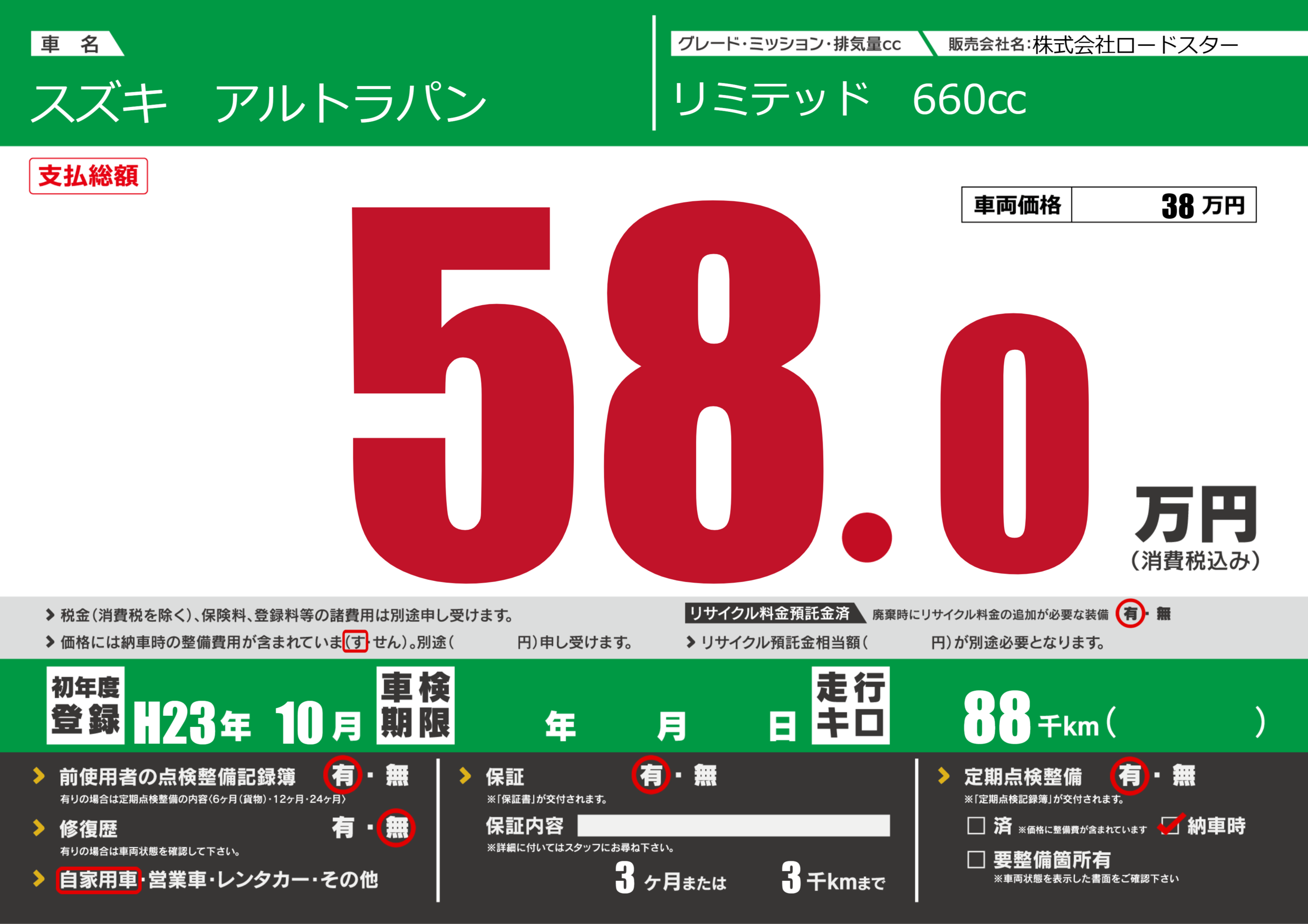 | 走行キロ | 8.8万km | 初年度登録 | H23年10月 |