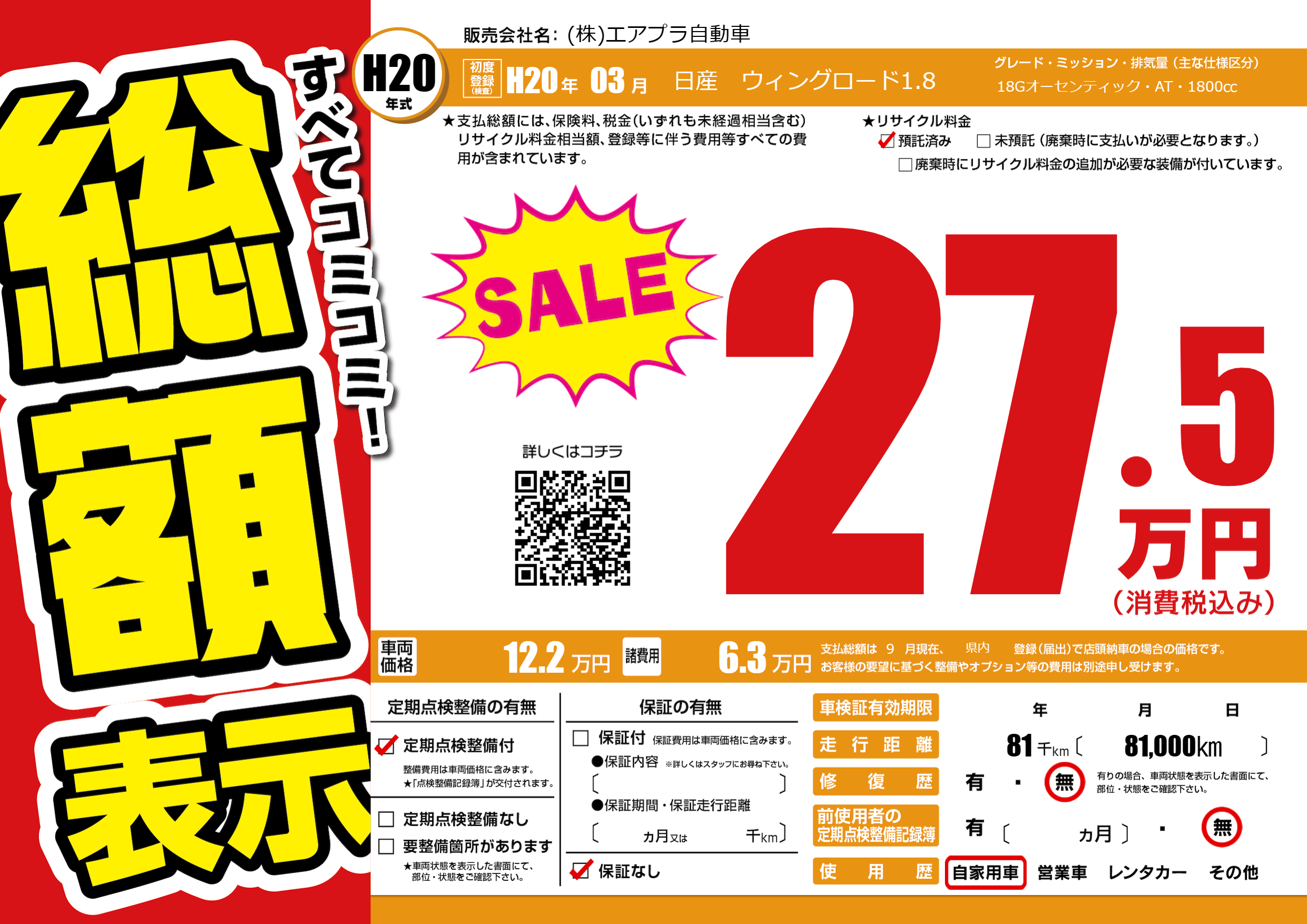 | 車名 | 日産 ウィングロード1.8 | グレード ミッション 排気量 |