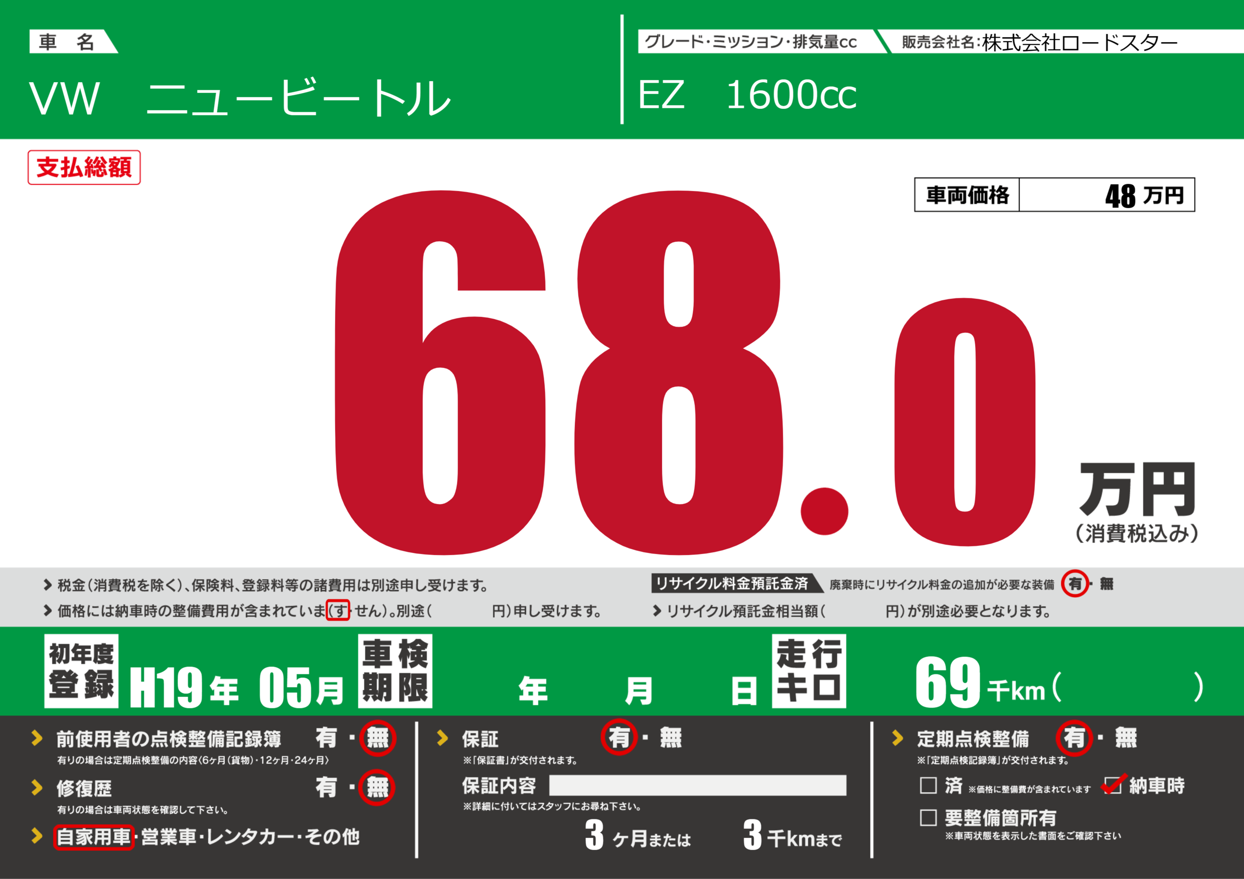 | 定期点検整備 | 定期点検整備あり 納車時あり | ||