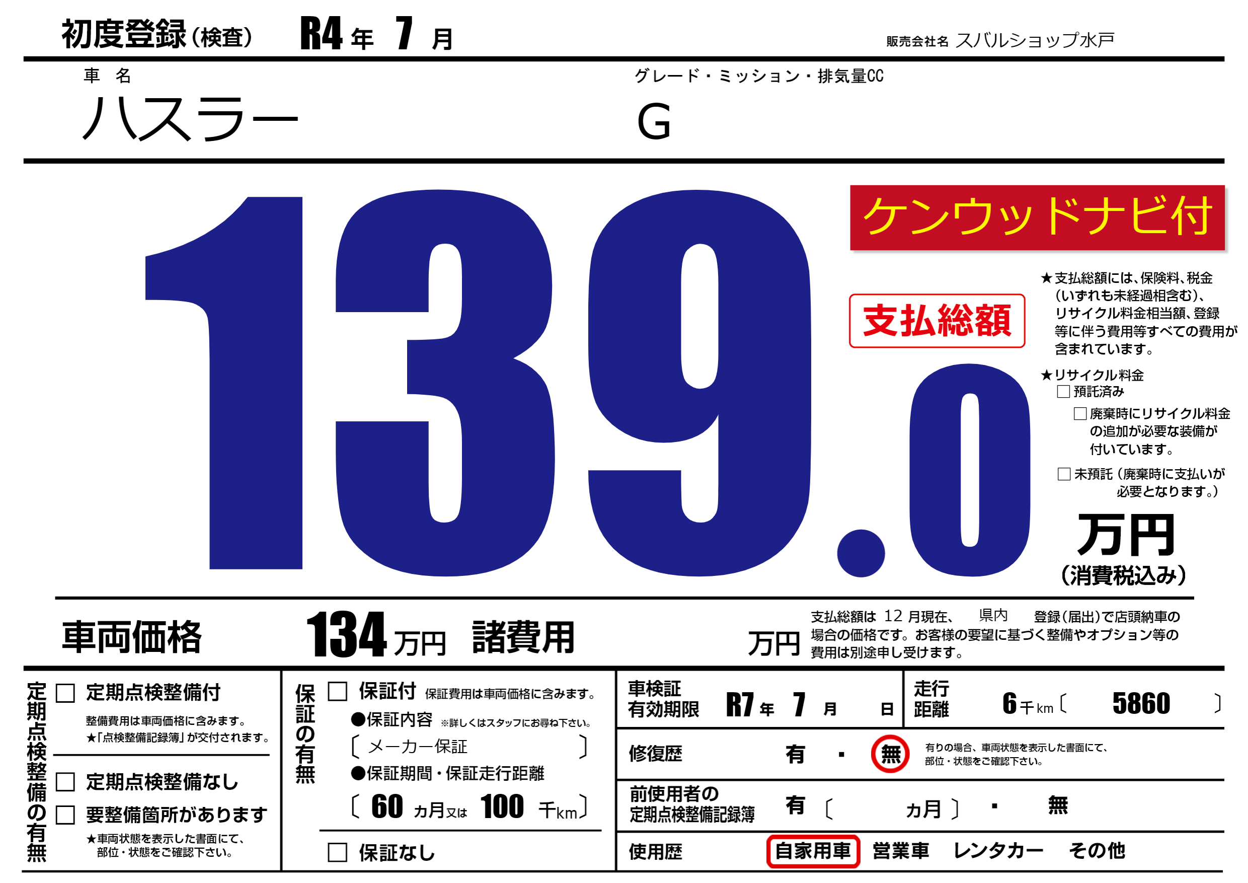 | 車名 | ハスラー | グレード ミッション 排気量 |