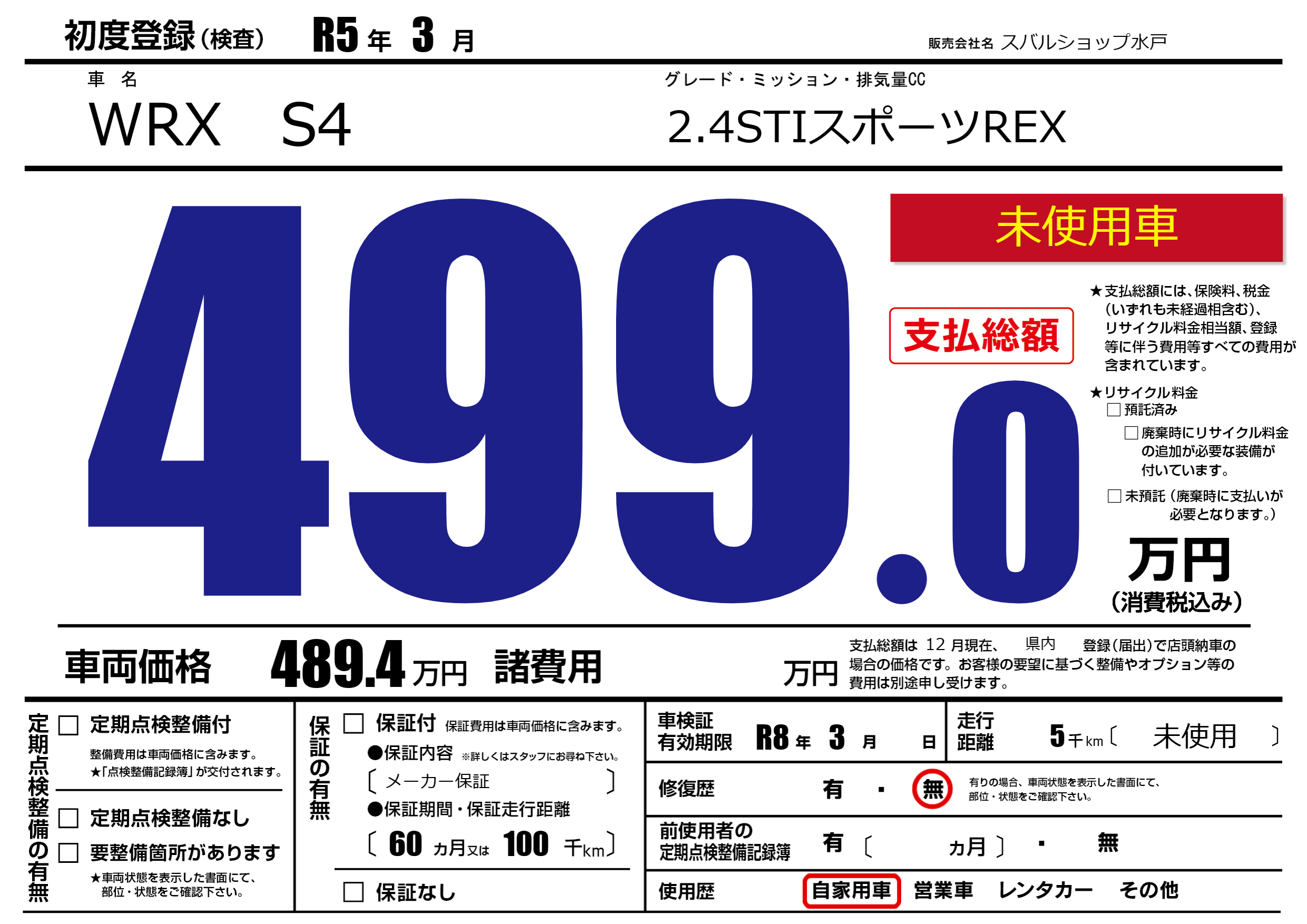 | 車名 | WRX S4 | グレード ミッション 排気量 |