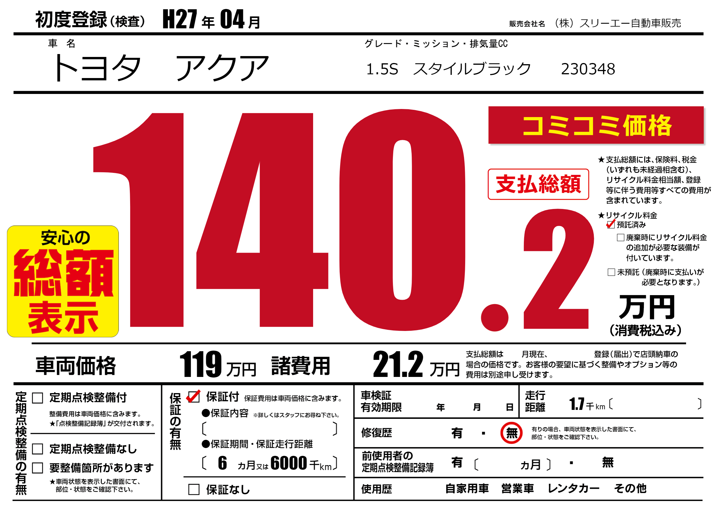 保証付き 保証内容(---) 6ヶ月または(6000)千kmまで |