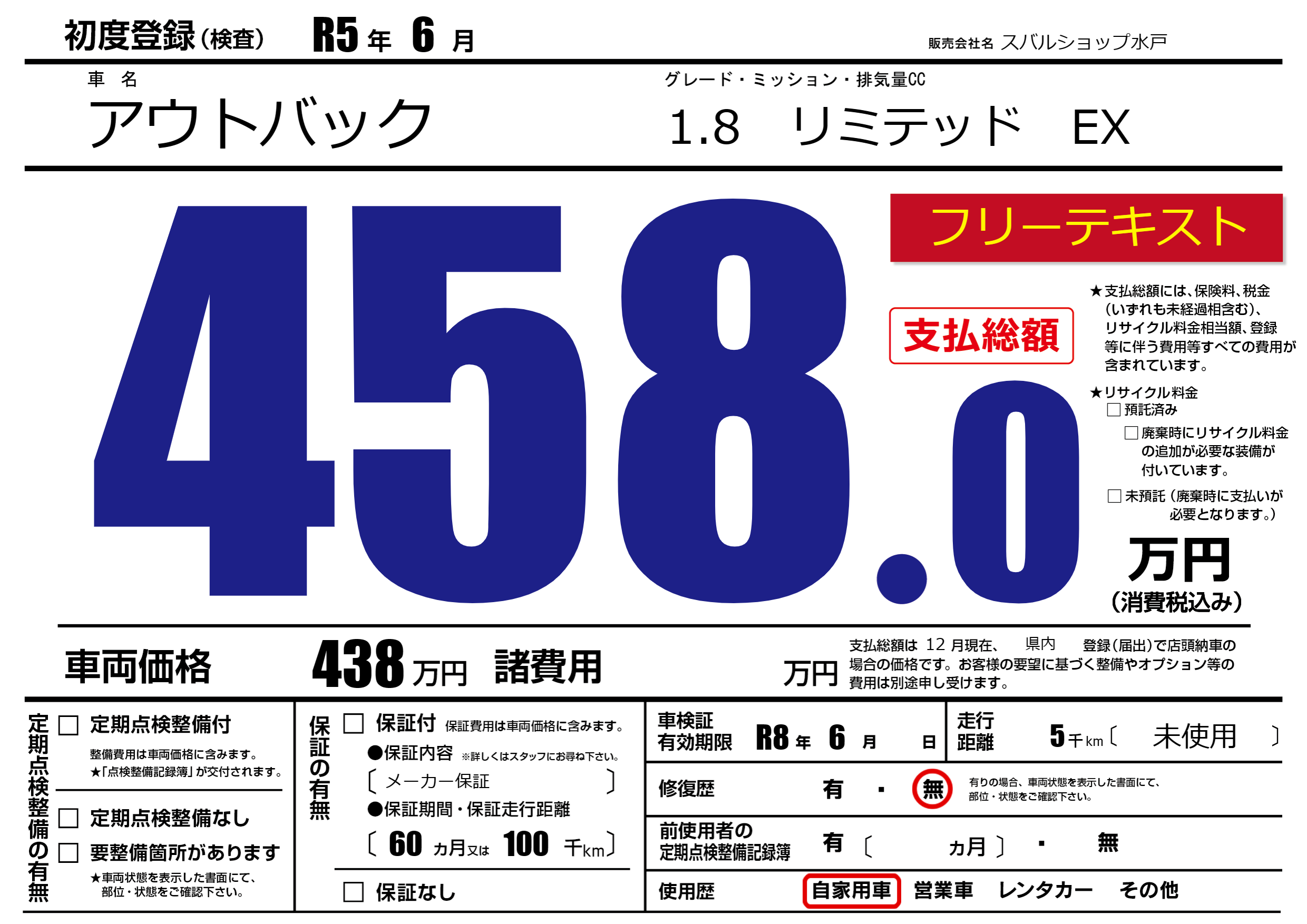 | 車名 | アウトバック | グレード ミッション 排気量 |