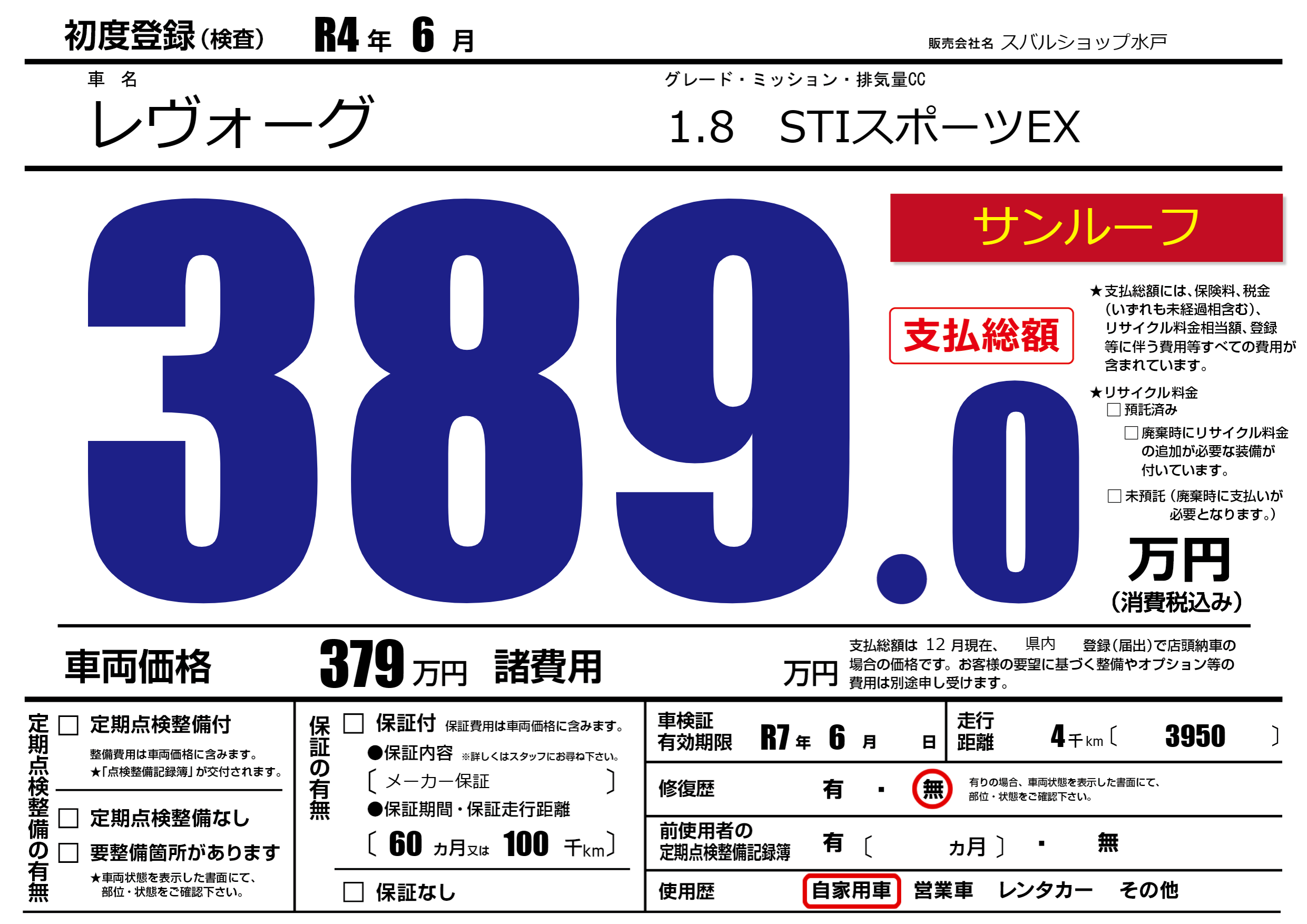 | 車名 | レヴォーグ | グレード ミッション 排気量 |