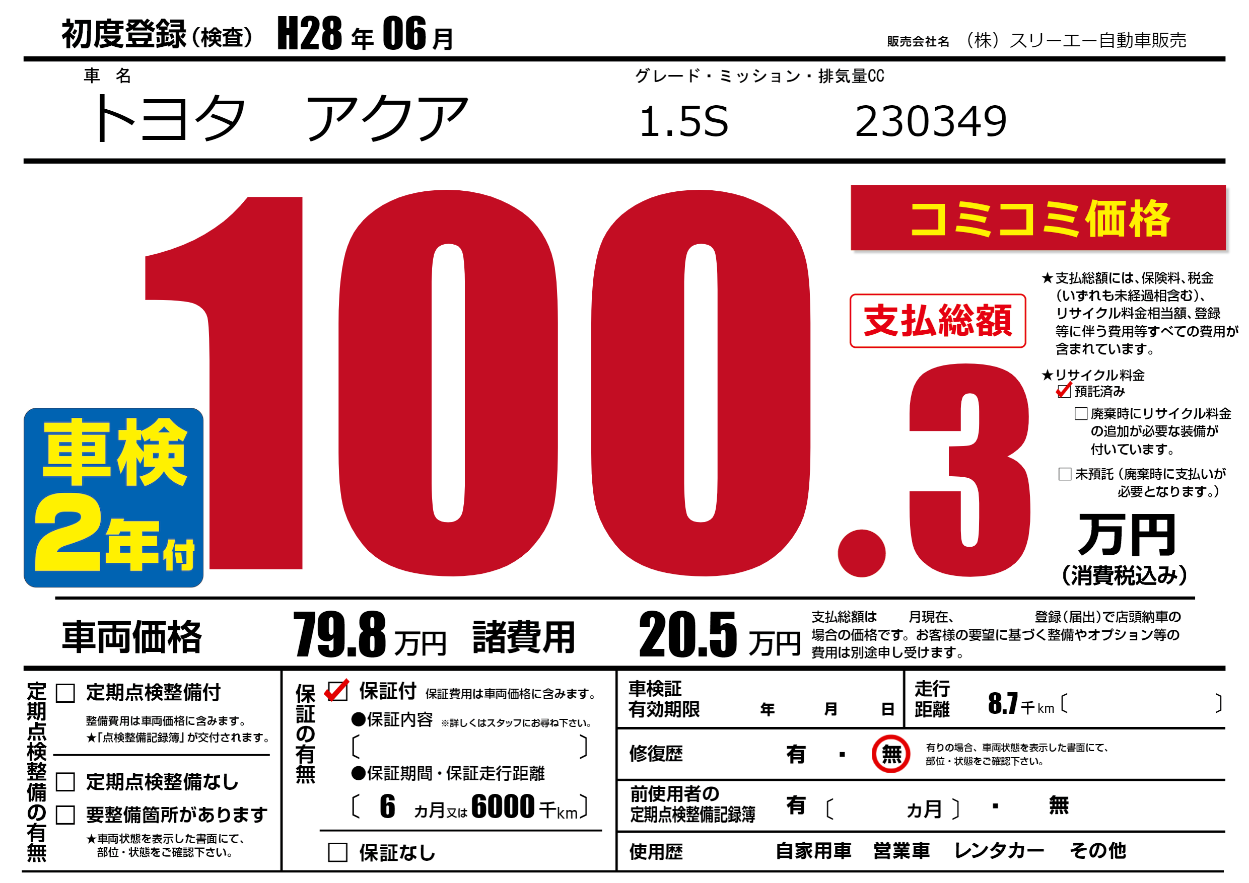 | 車名 | トヨタ アクア | グレード ミッション 排気量 |