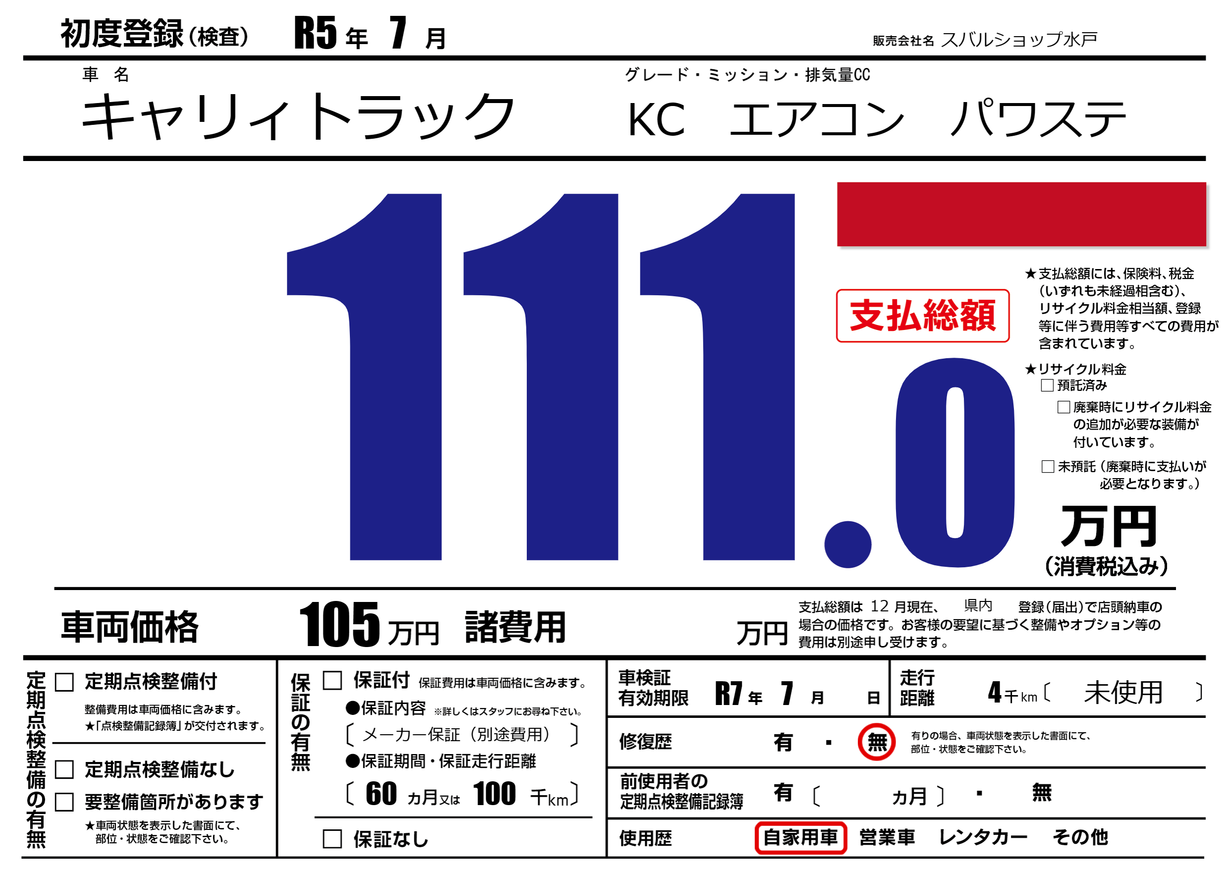 | 走行キロ | 0.4万km | 初年度登録 | R5年7月 |