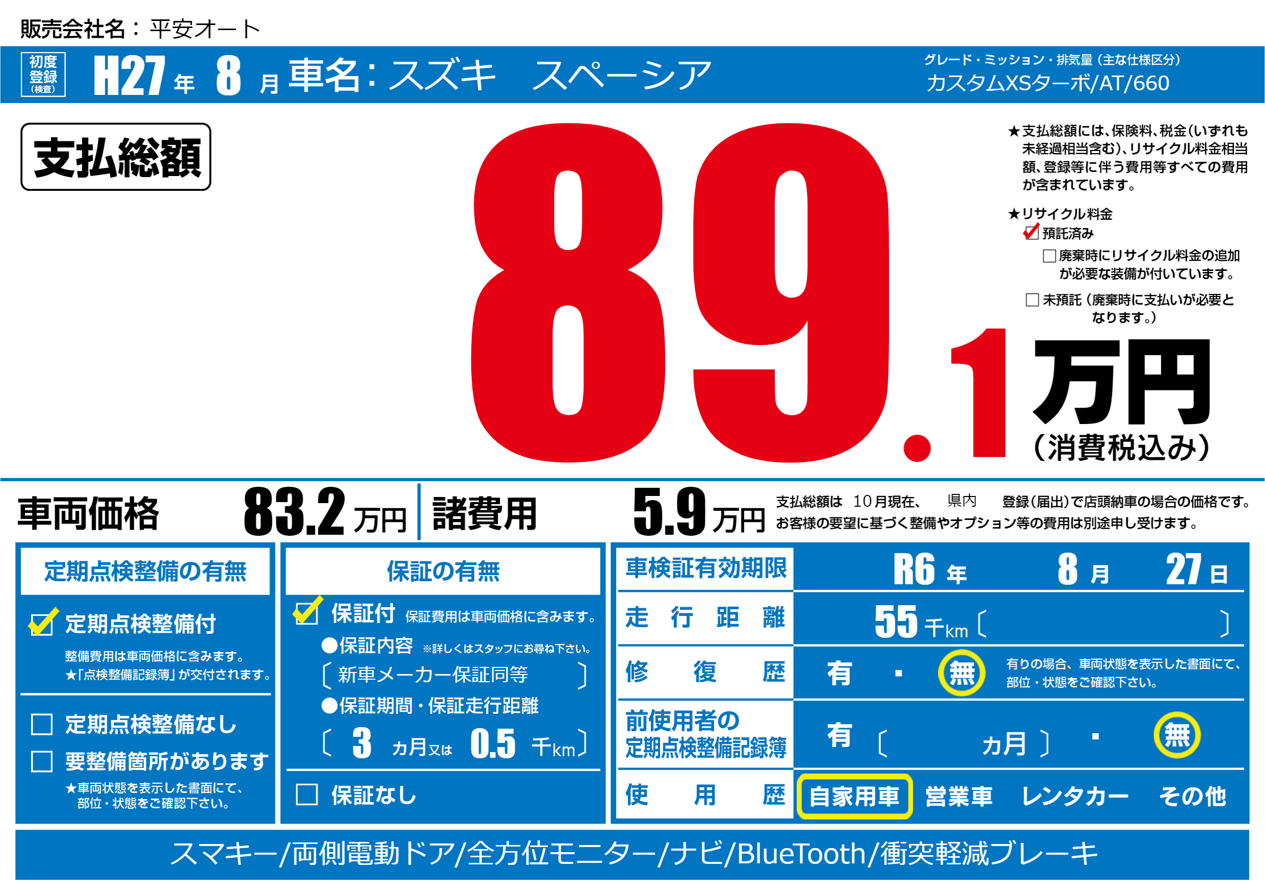 | 車名 | スズキ スペーシア | グレード ミッション 排気量 |