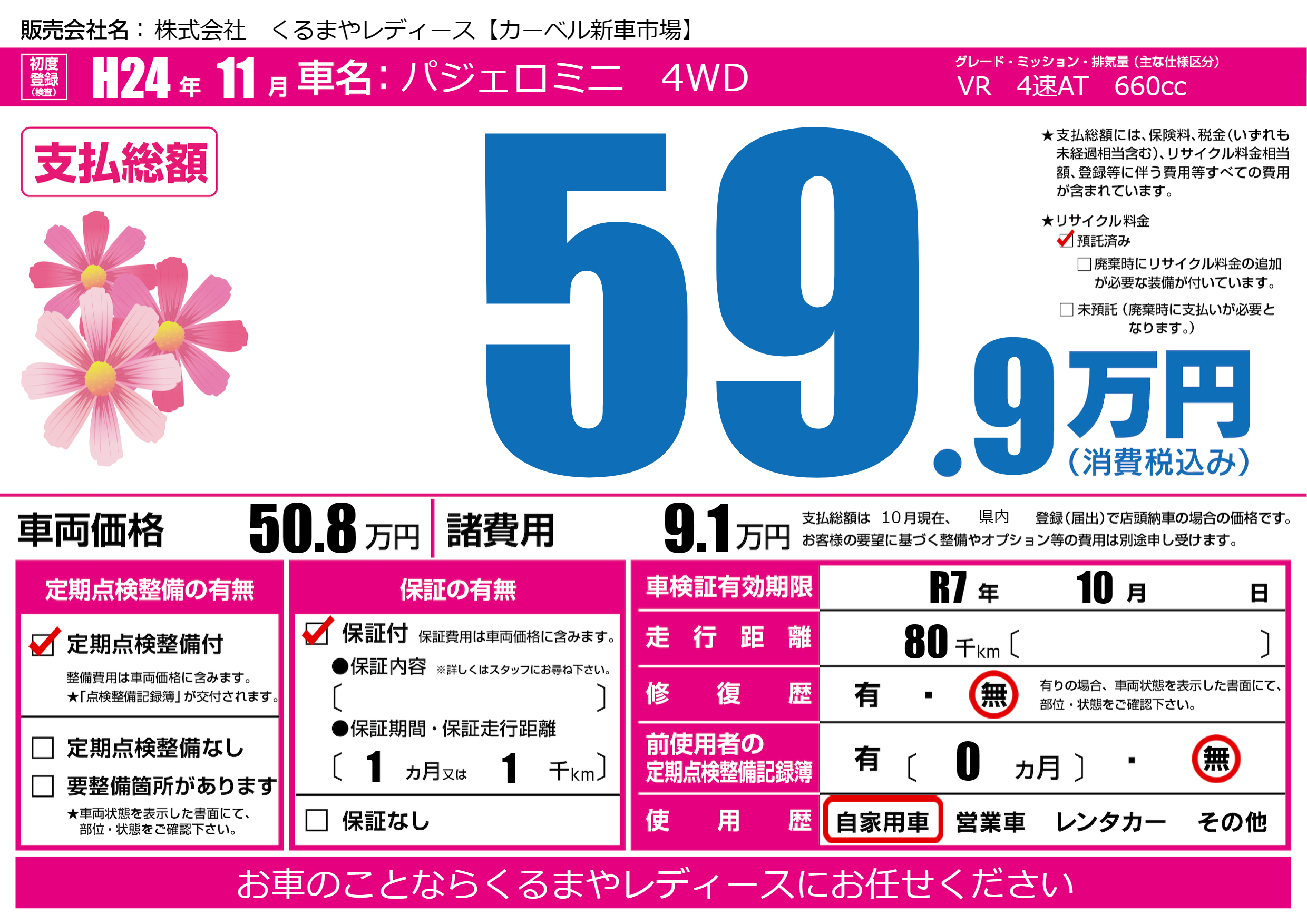 | 車名 | パジェロミニ 4WD | グレード ミッション 排気量 |