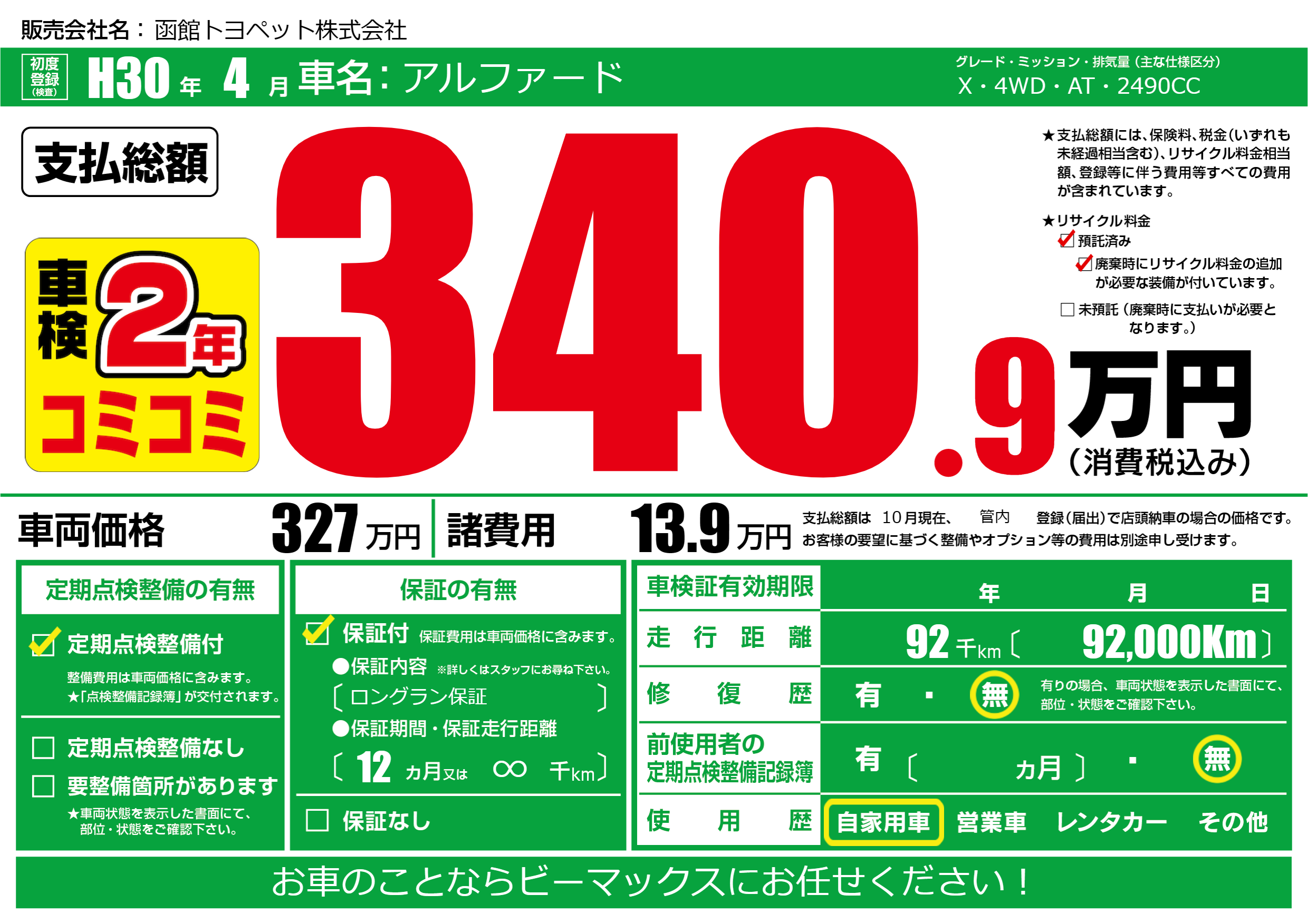 | 走行キロ | 9.2万km | 初年度登録 | H30年4月 |