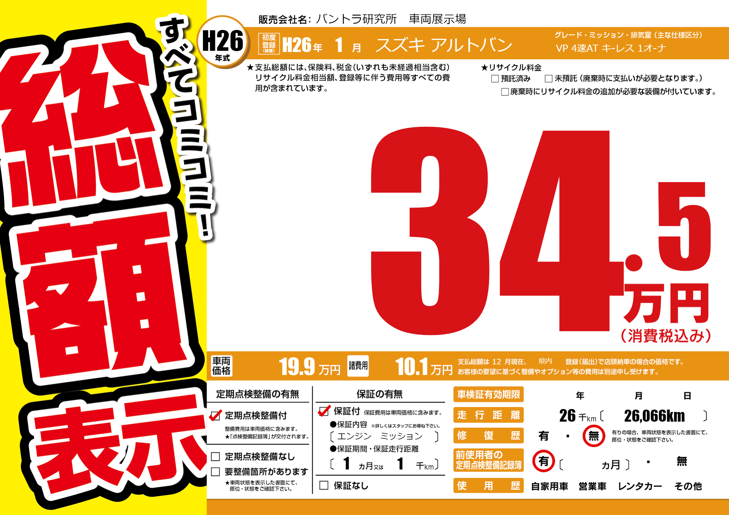 | 車名 | スズキ アルトバン | グレード ミッション 排気量 |