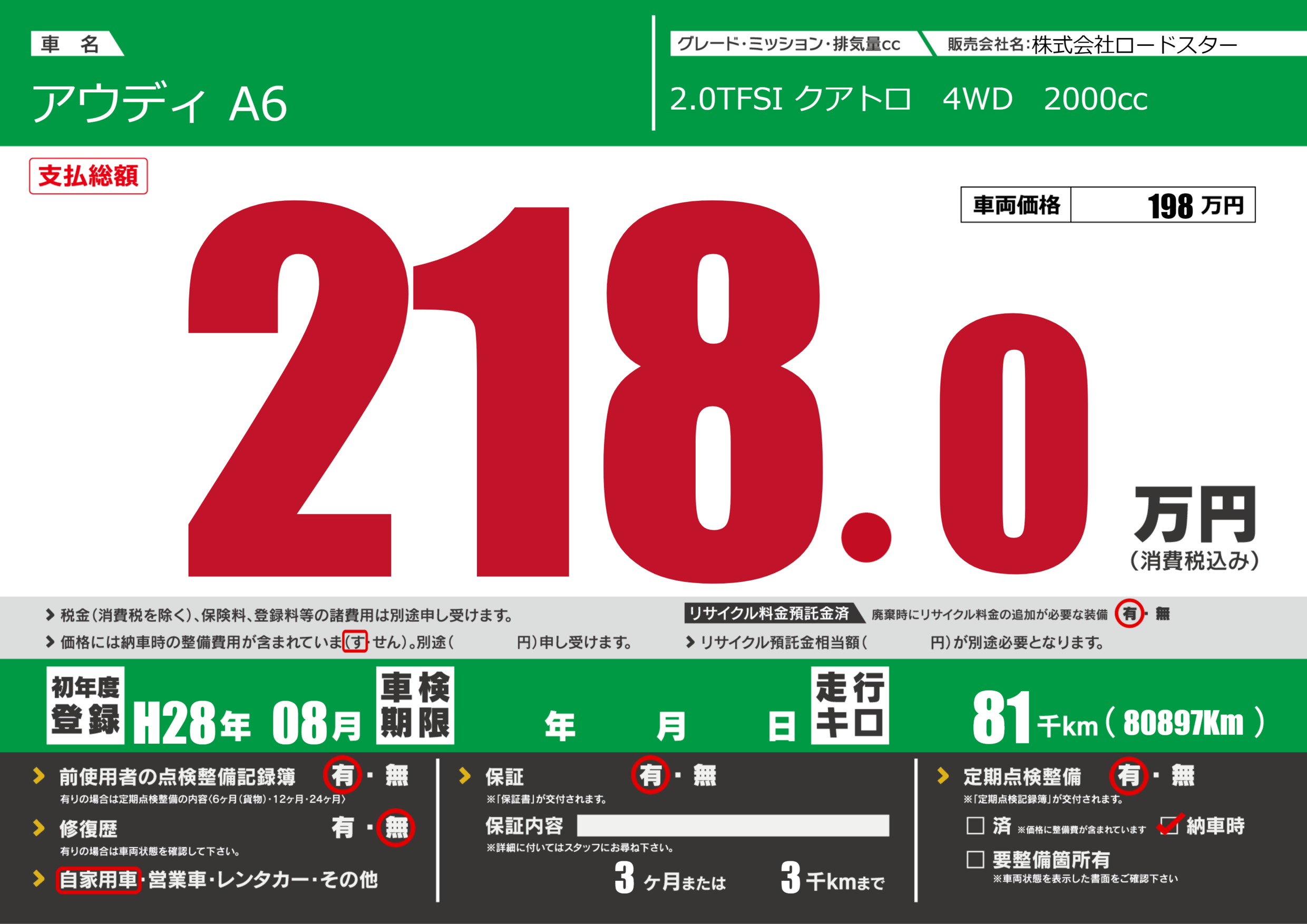 | 車名 | アウディ A6 | グレード ミッション 排気量 |