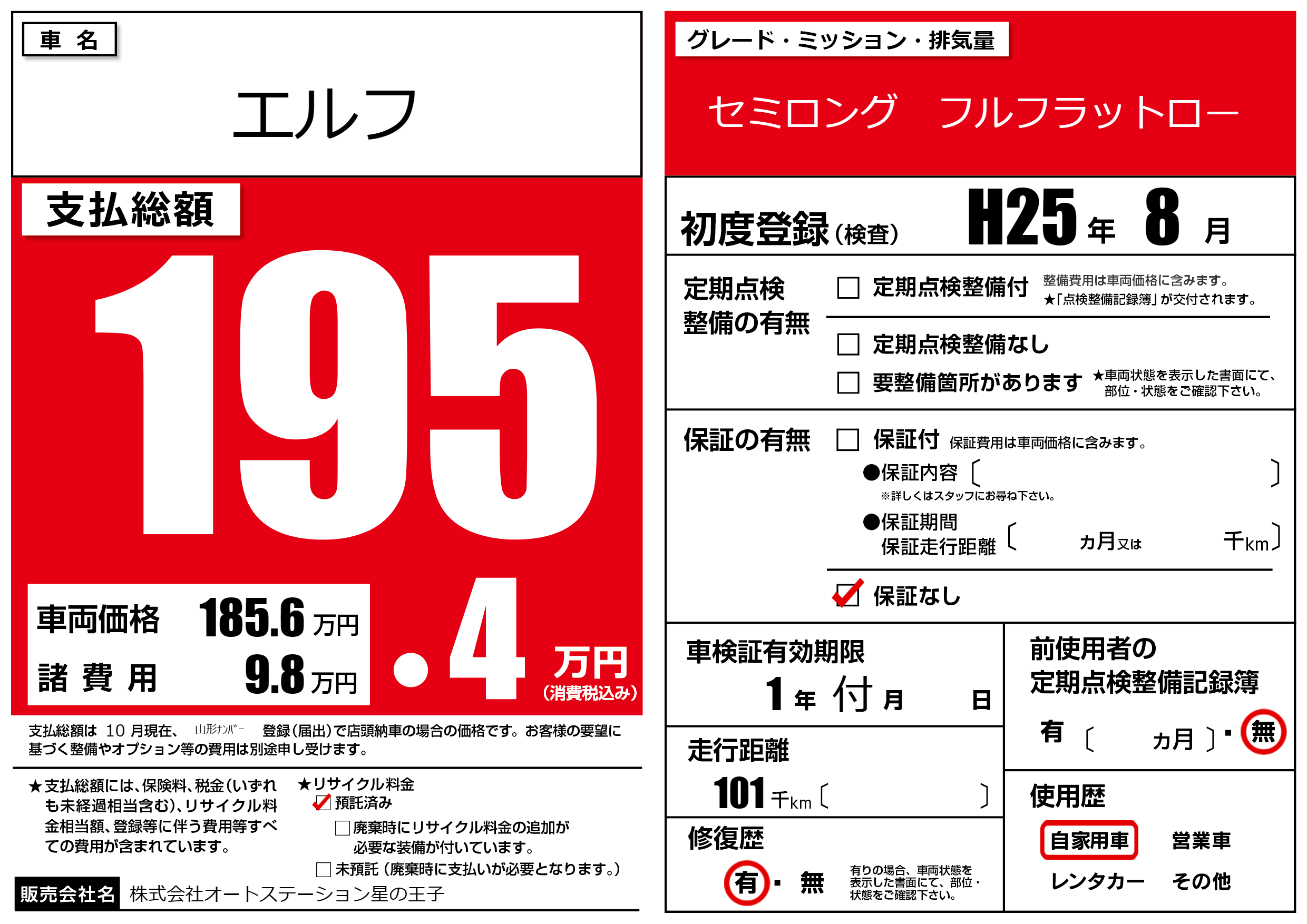 | 走行キロ | 10.1万km | 初年度登録 | H25年8月 |