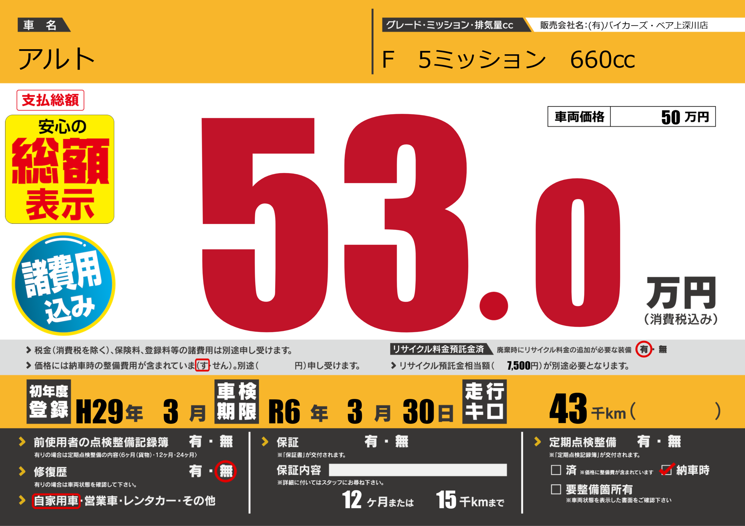 | 走行キロ | 4.3万km | 初年度登録 | H29年3月 |
