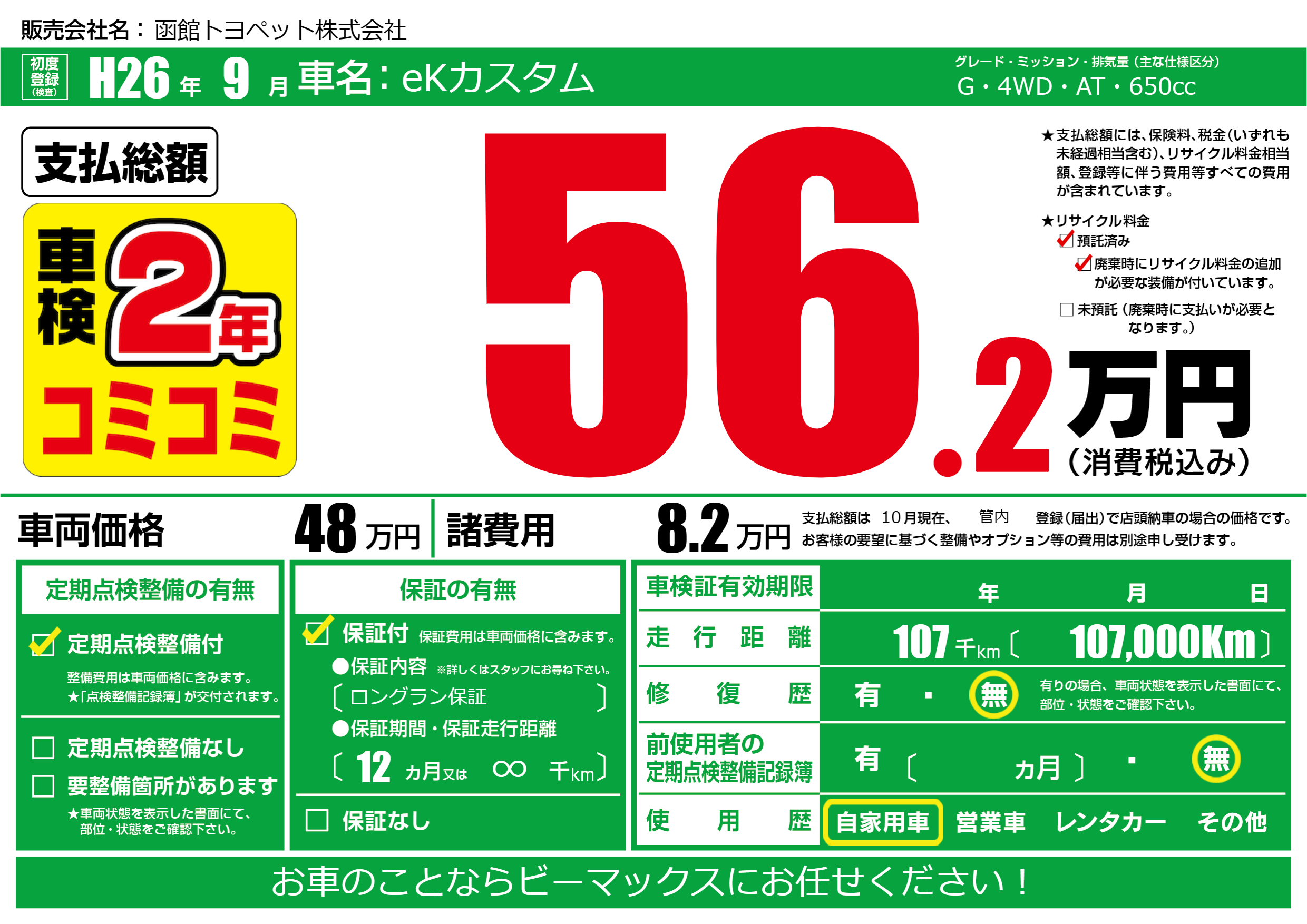 | 走行キロ | 10.7万km | 初年度登録 | H26年9月 |