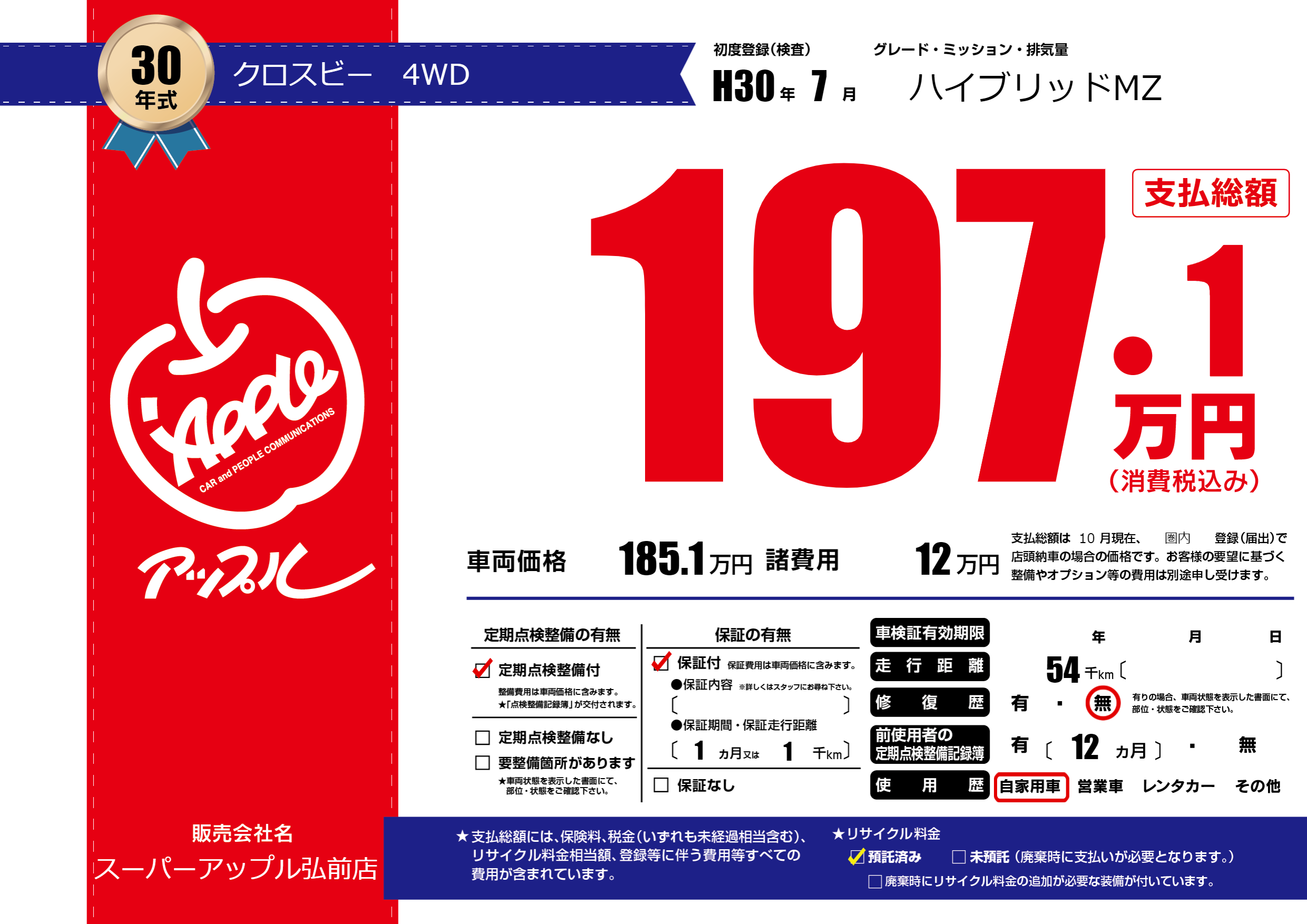 | 車名 | クロスビー 4WD | グレード ミッション 排気量 |