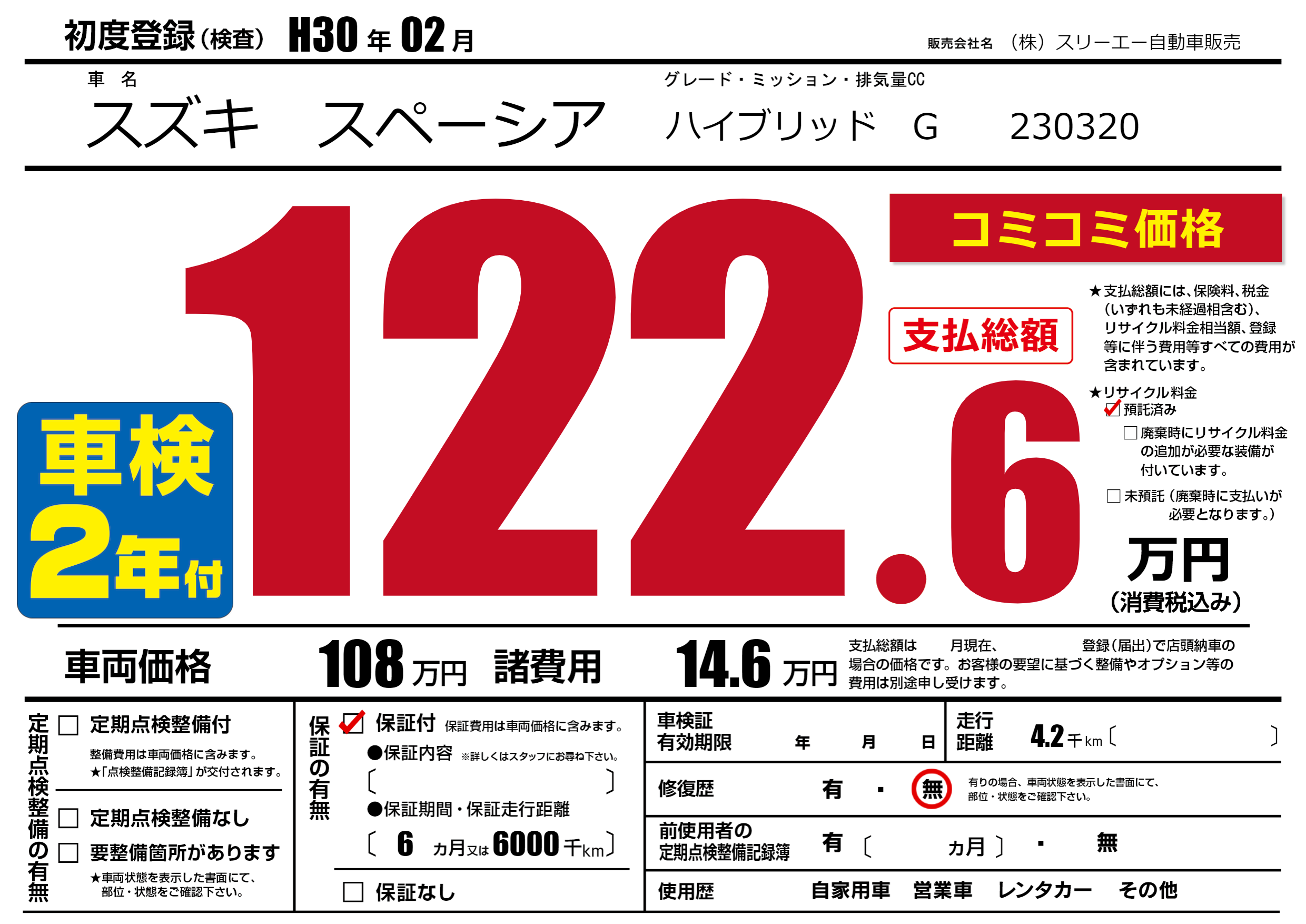 | 走行キロ | 0.4万km | 初年度登録 | H30年02月 |