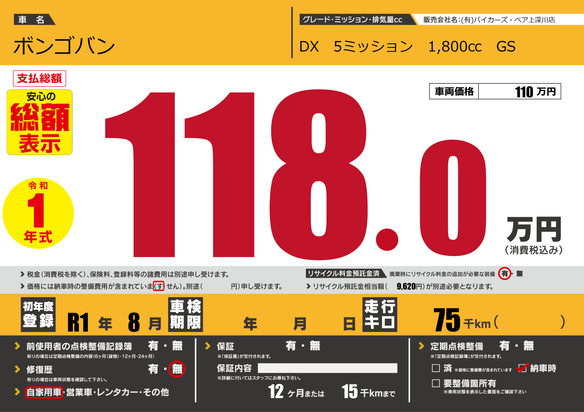 | 車名 | ボンゴバン | グレード ミッション 排気量 |