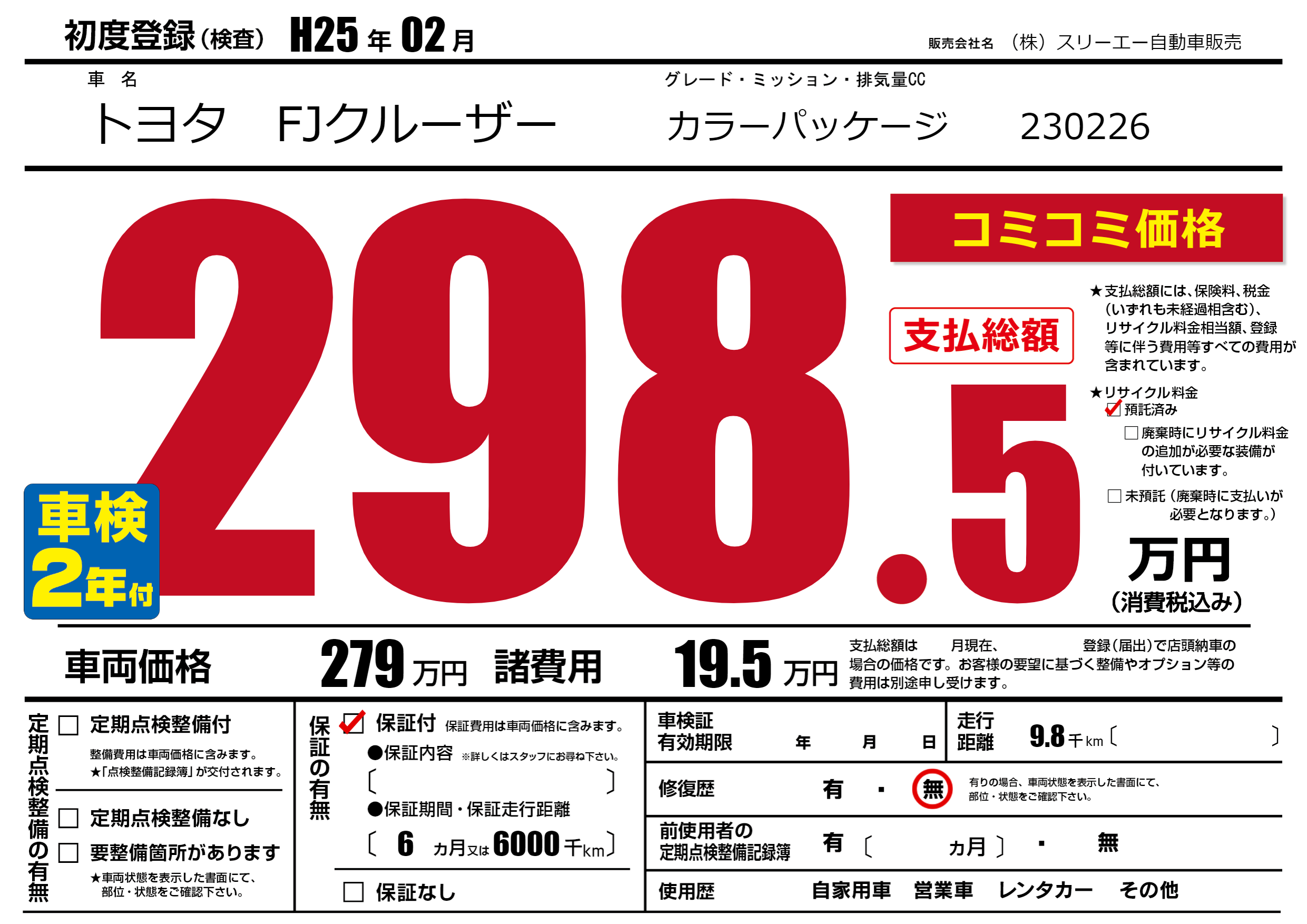 | 走行キロ | 0.9万km | 初年度登録 | H25年02月 |