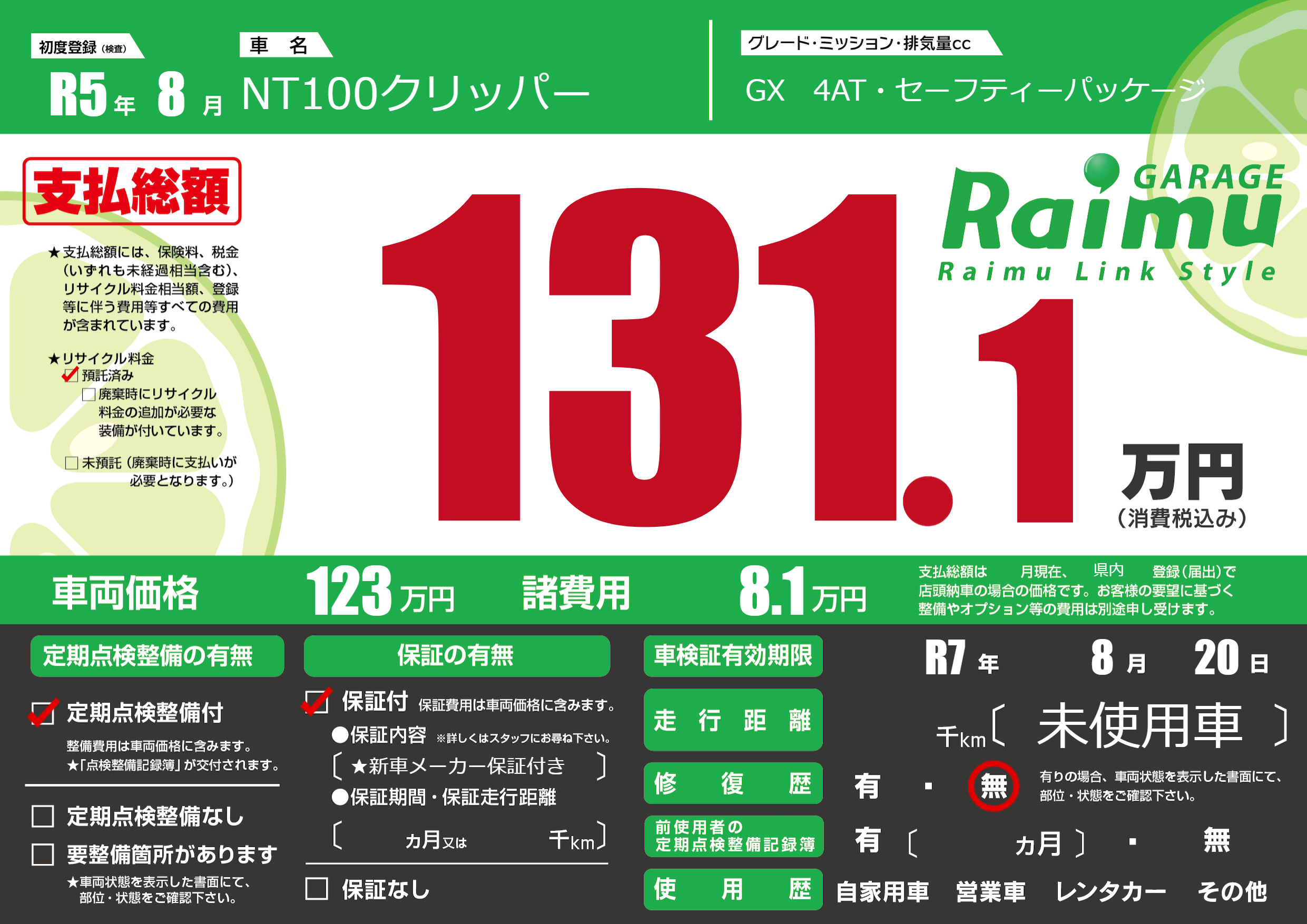 なし | 車検制限 | R7年8月20月 |