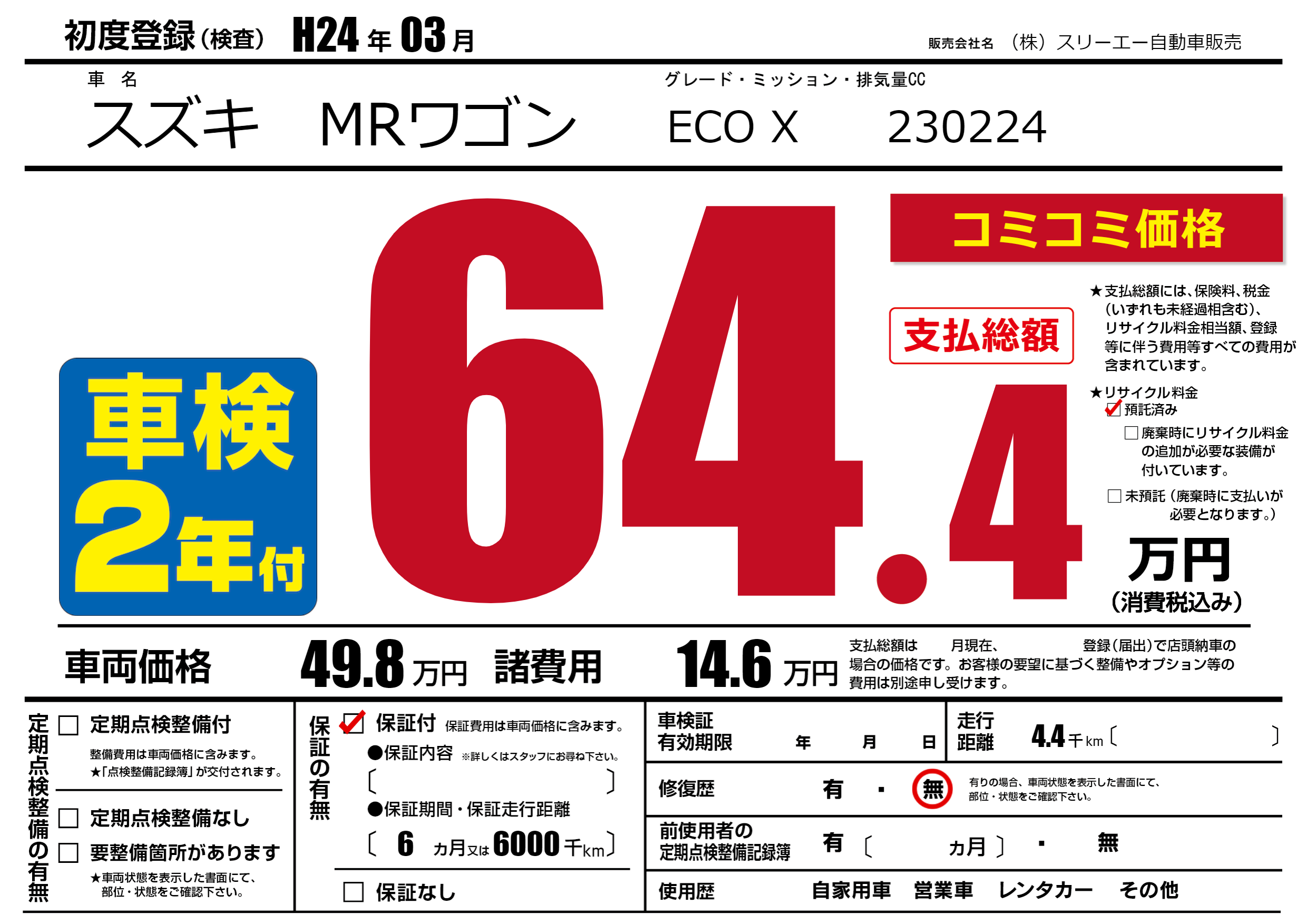 | 車名 | スズキ MRワゴン | グレード ミッション 排気量 |