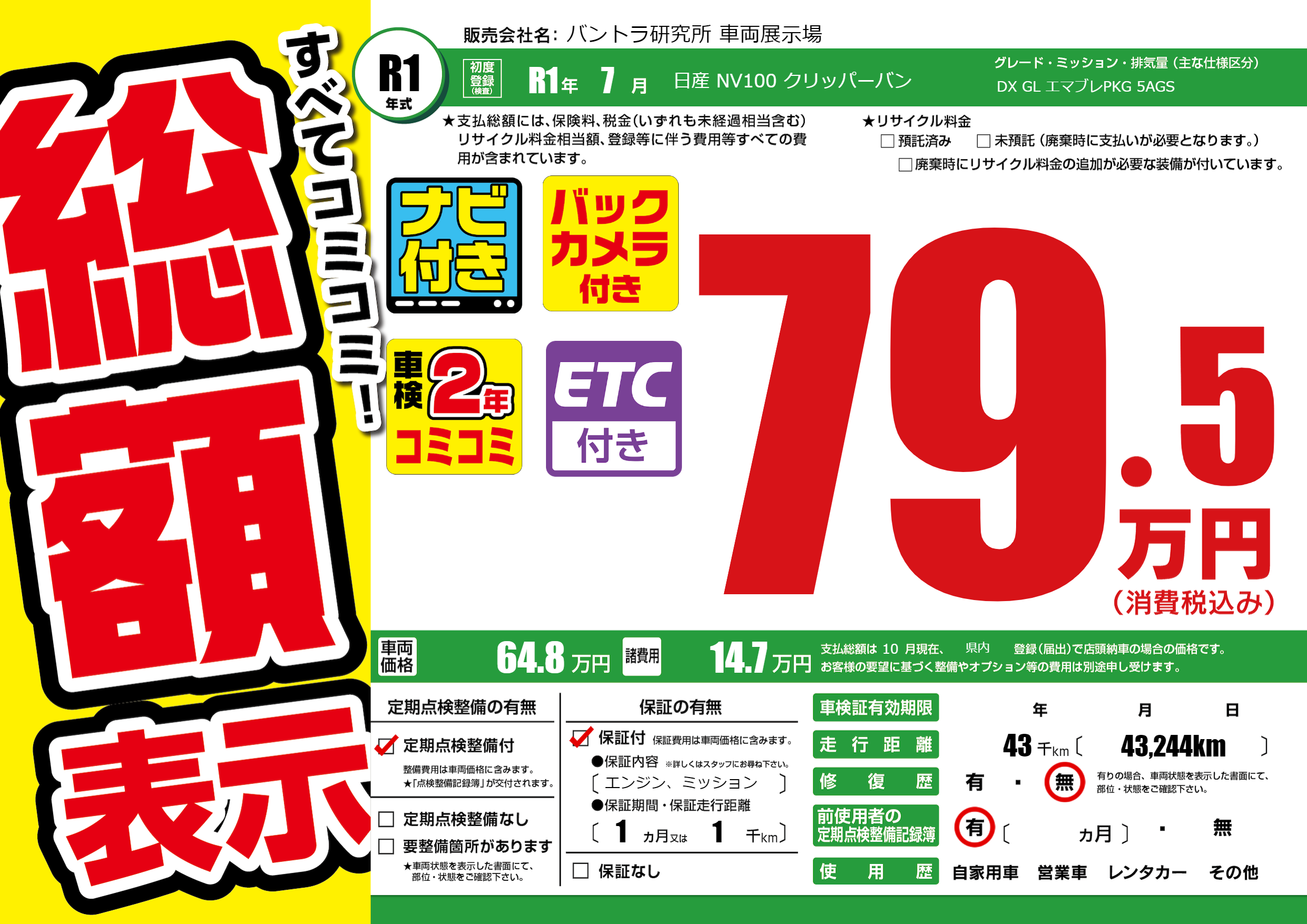 | 車名 | 日産 NV100 クリッパーバン | グレード ミッション 排気量 |