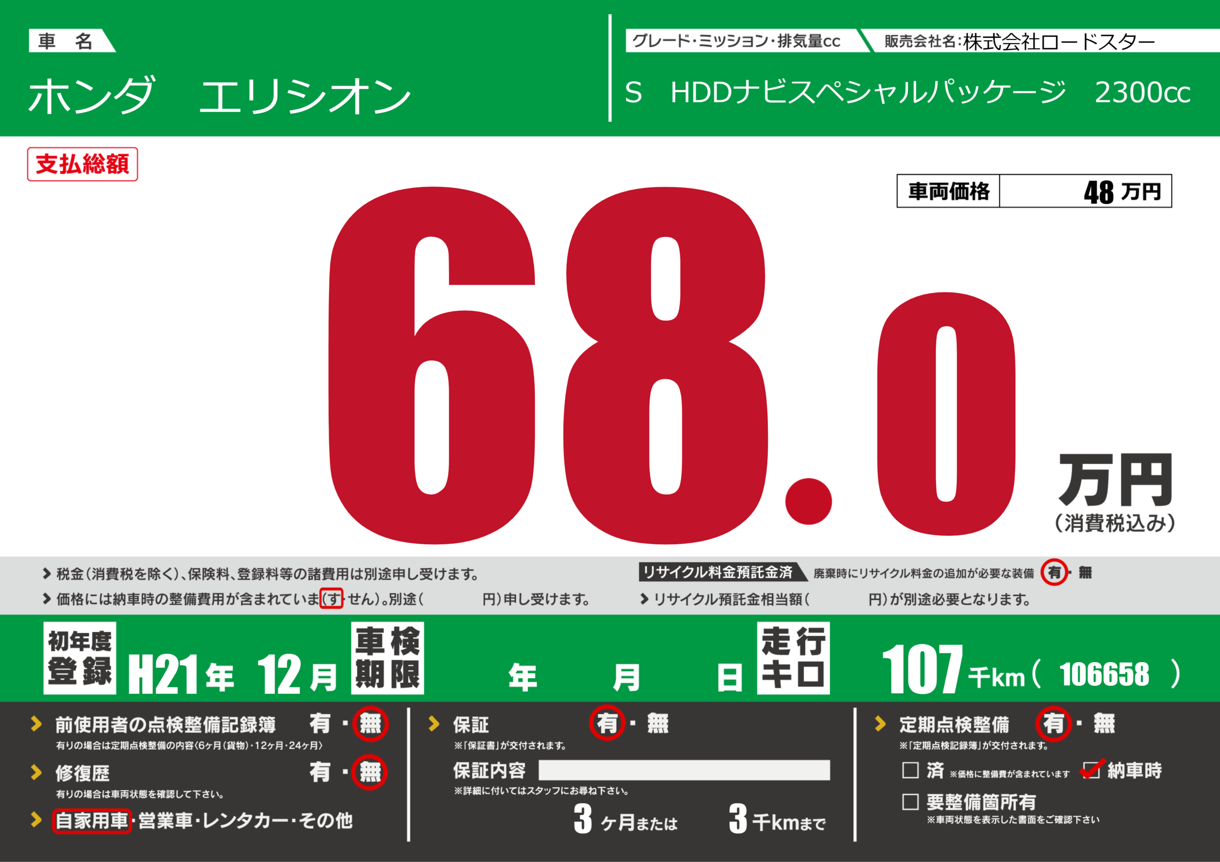 | 走行キロ | 10.7万km | 初年度登録 | H21年12月 |