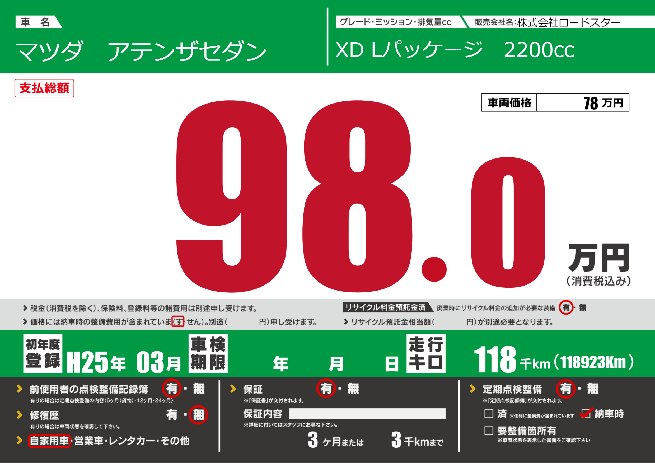 | 走行キロ | 11.8万km | 初年度登録 | H25年03月 |