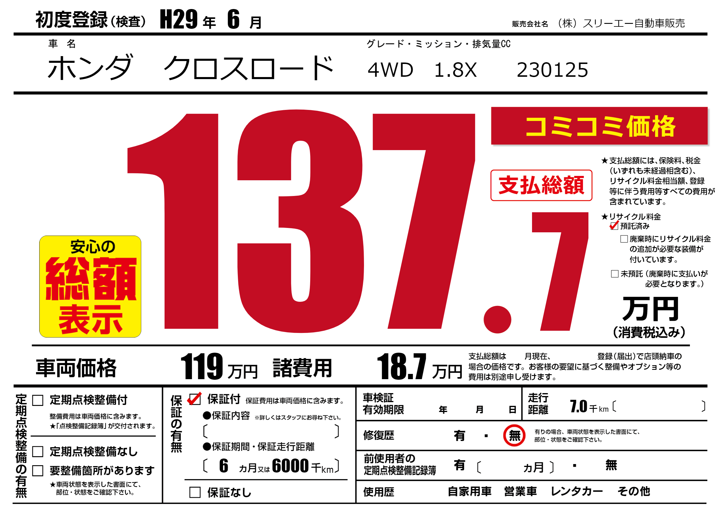 保証付き 保証内容(---) 6ヶ月または(6000)千kmまで |