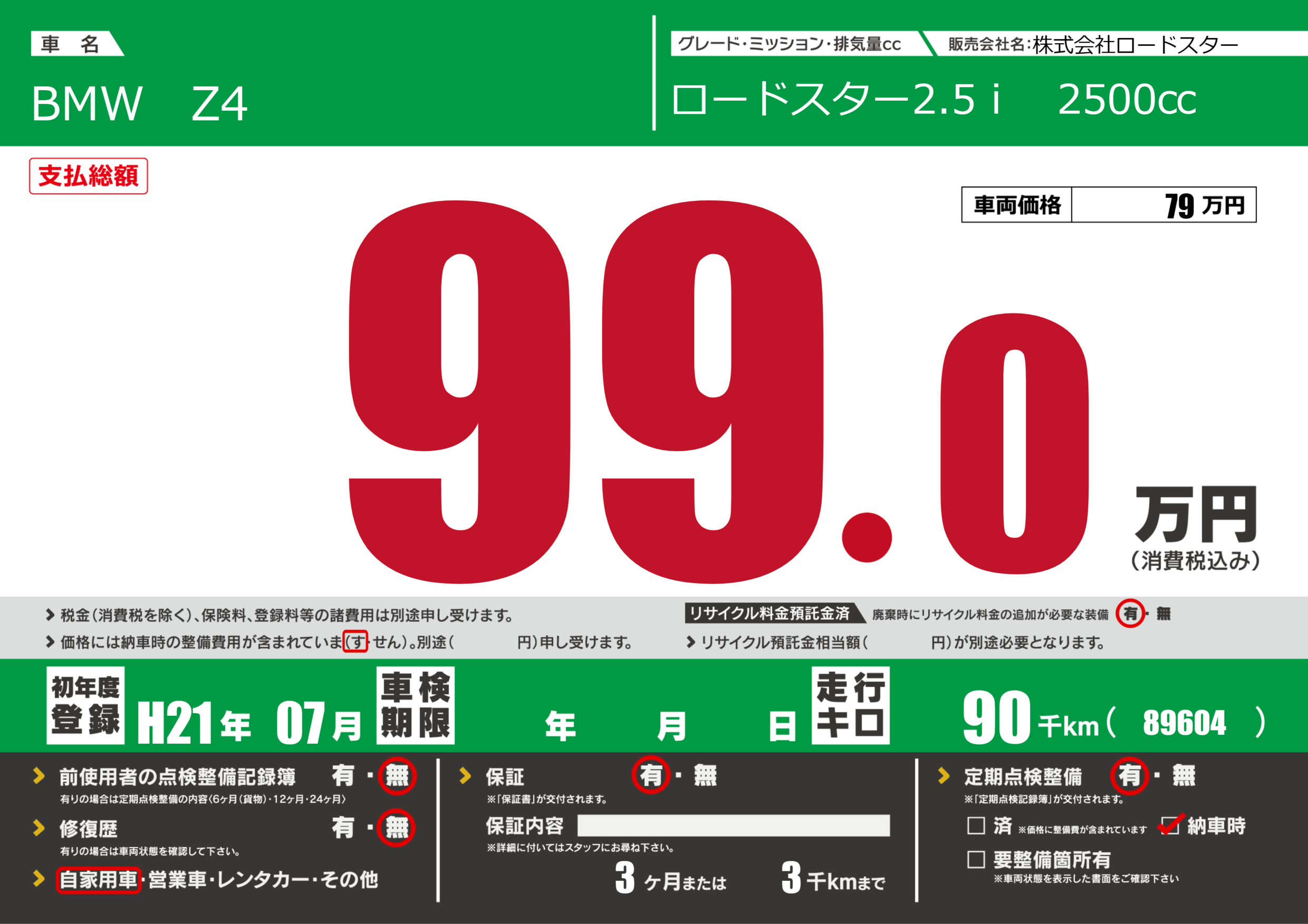 | 車名 | BMW Z4 | グレード ミッション 排気量 |