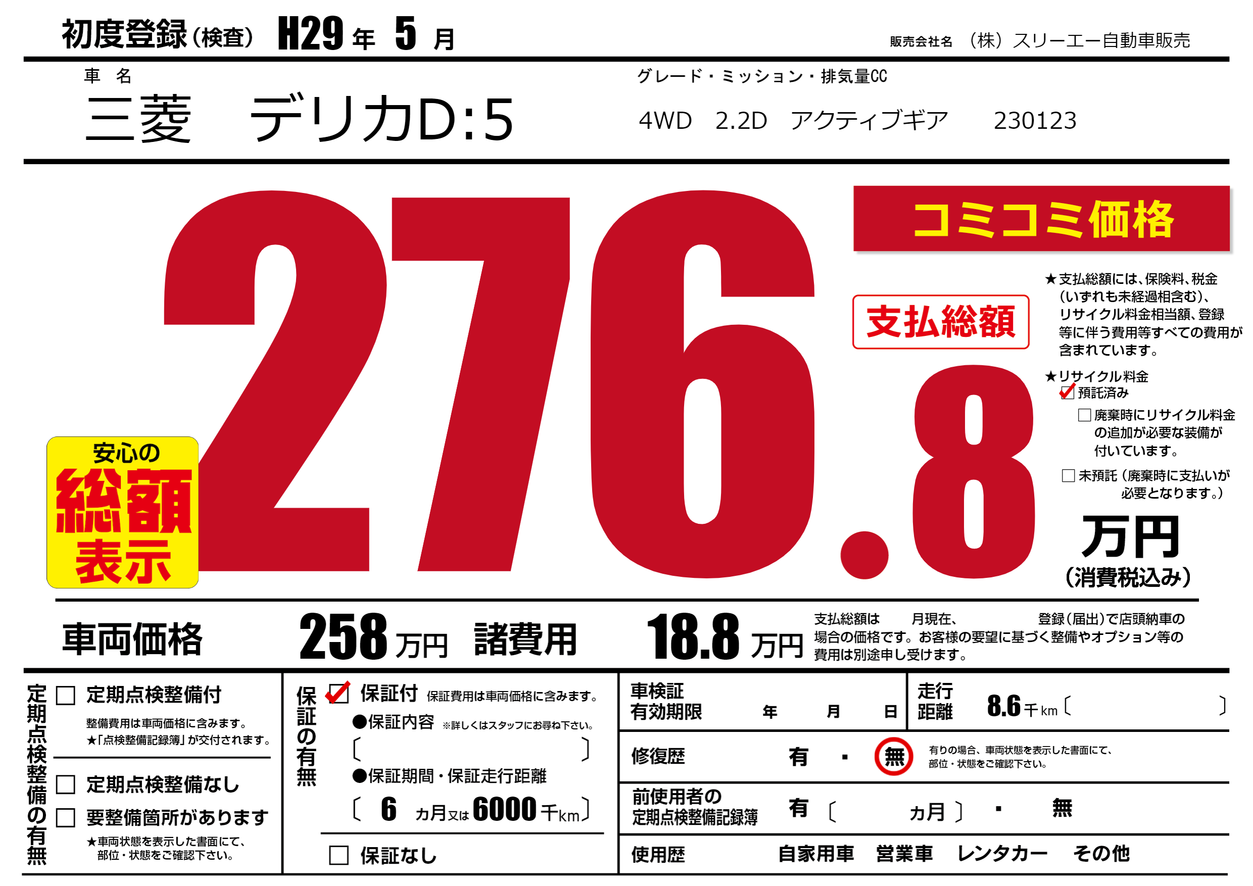 | 車名 | 三菱 デリカD:5 | グレード ミッション 排気量 |