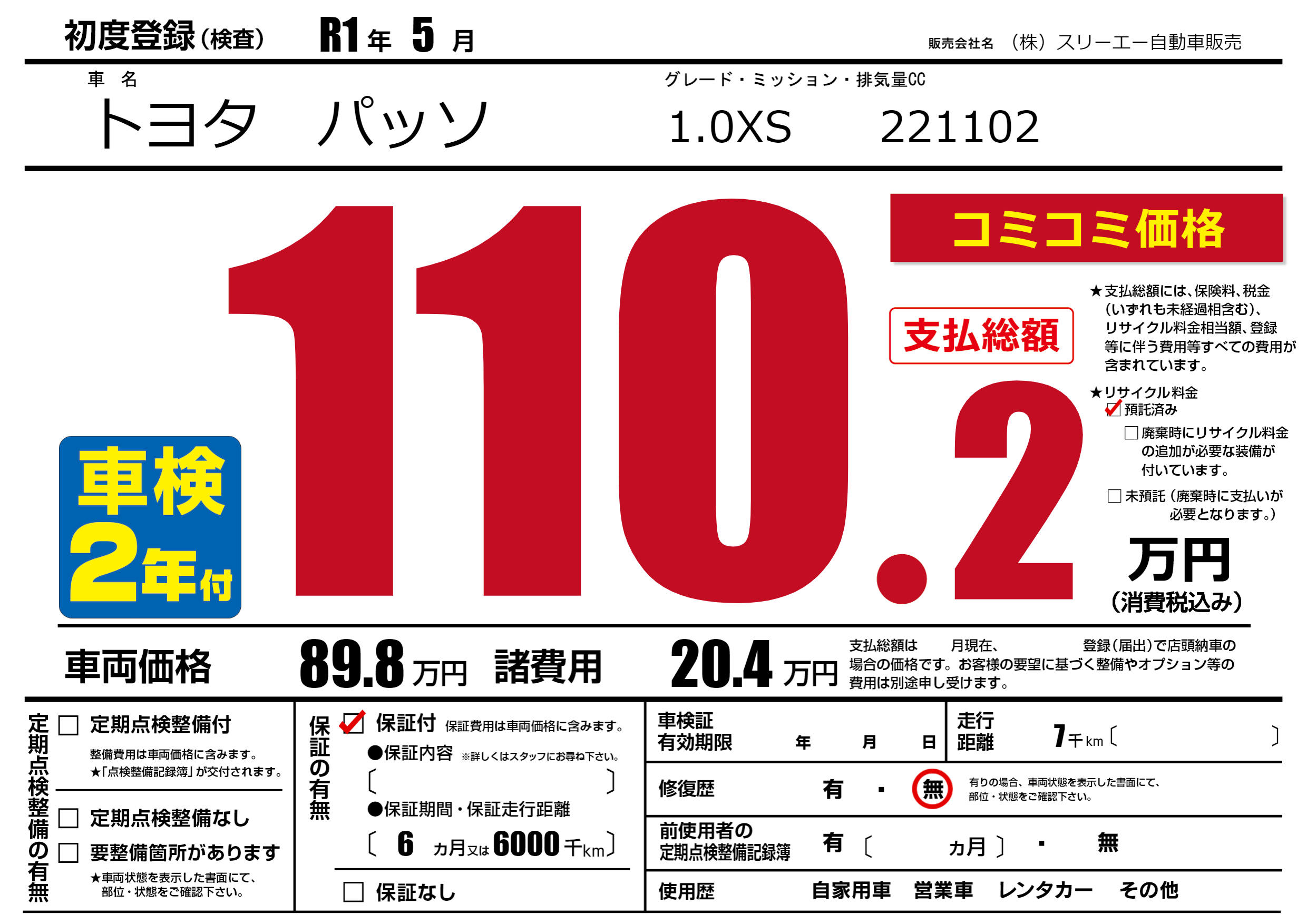 | 車名 | トヨタ パッソ | グレード ミッション 排気量 |