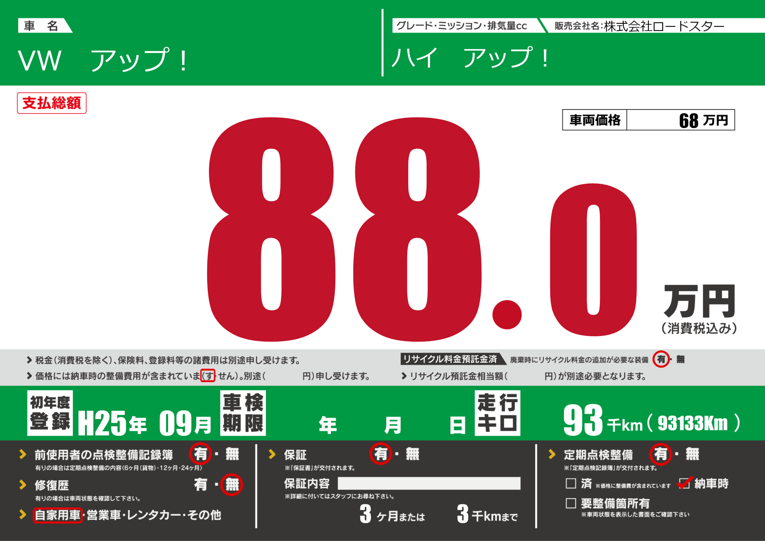 保証付き 保証内容(---) 3ヶ月または(3)千kmまで |