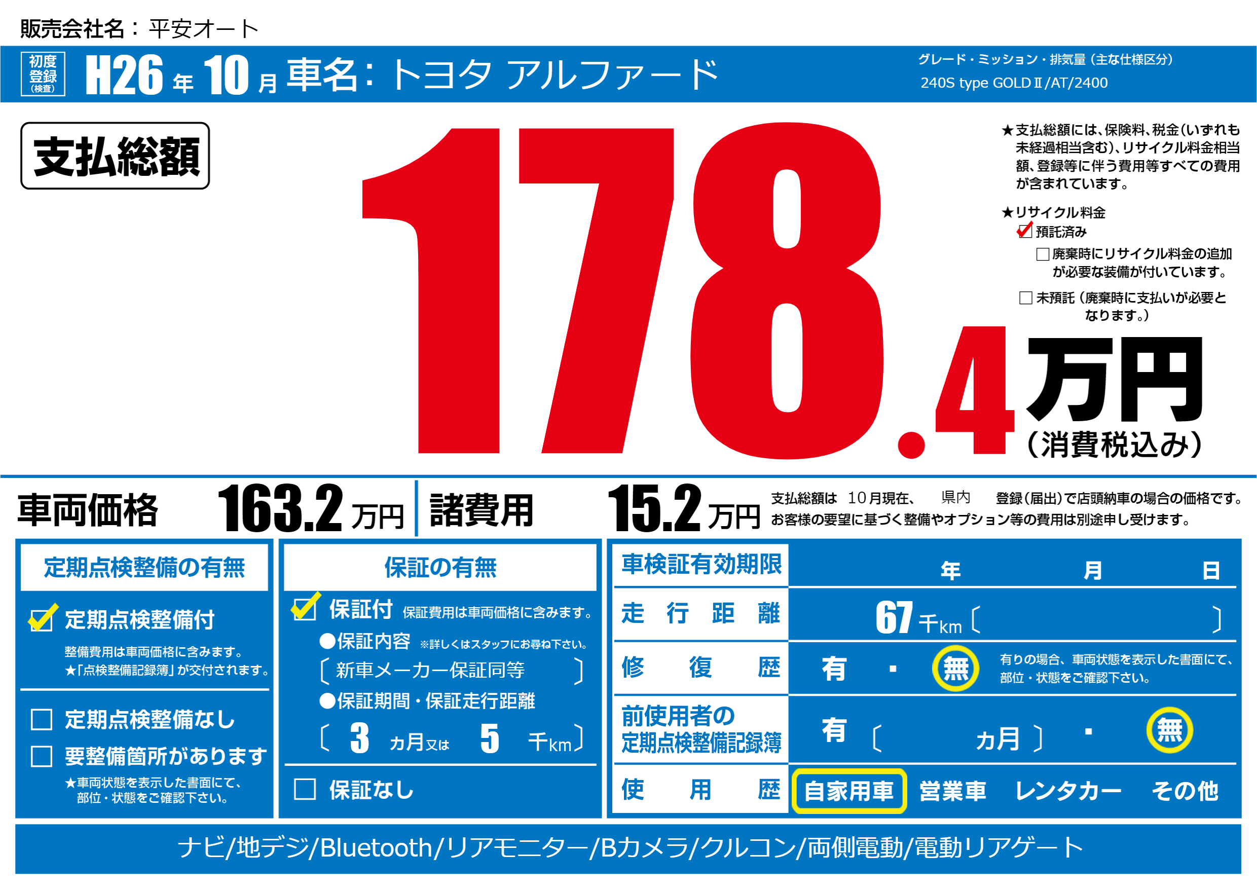| 走行キロ | 6.7万km | 初年度登録 | H26年10月 |