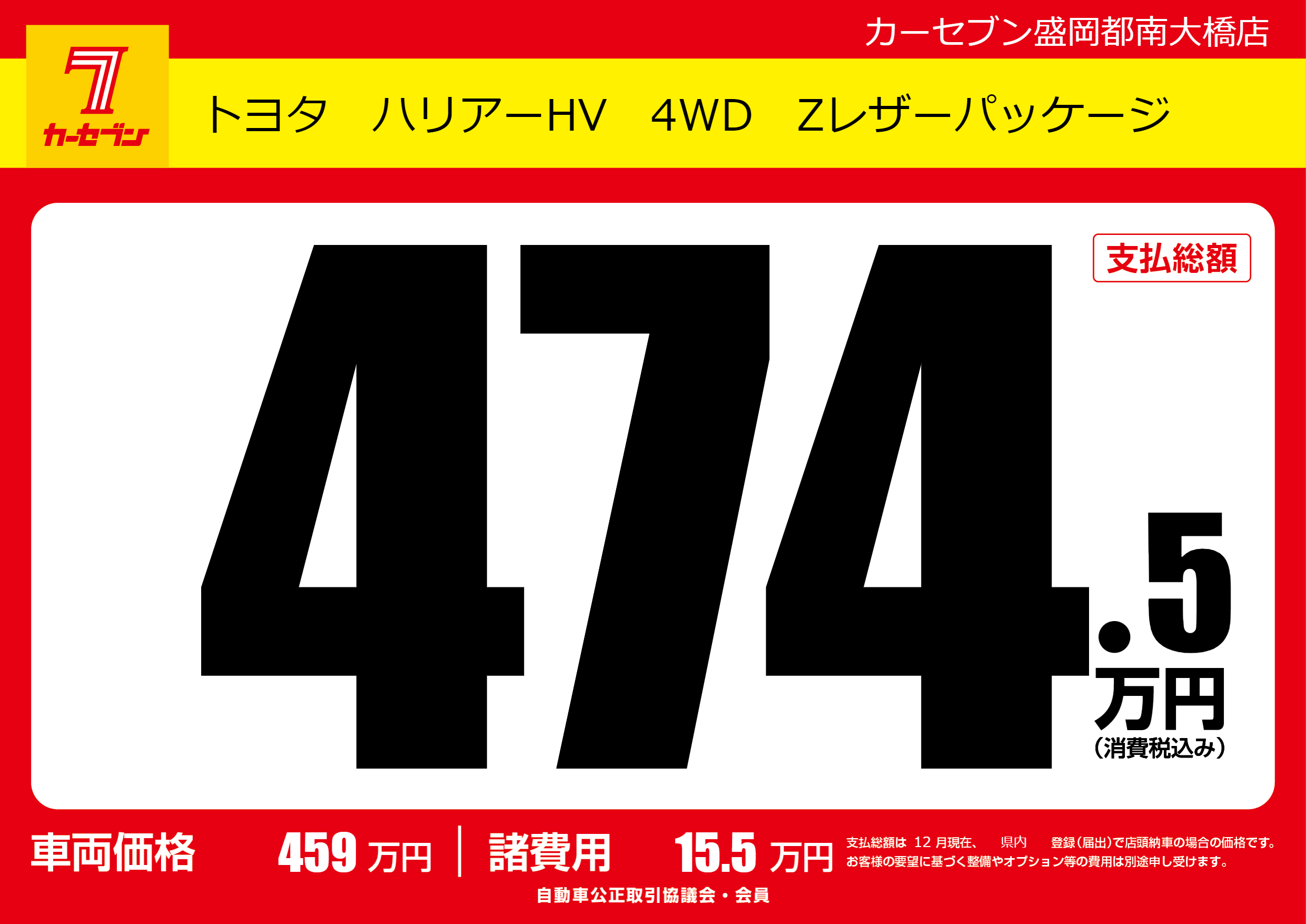 | 車名 | トヨタ ハリアーHV 4WD Zレザーパッケージ | グレード ミッション 排気量 |