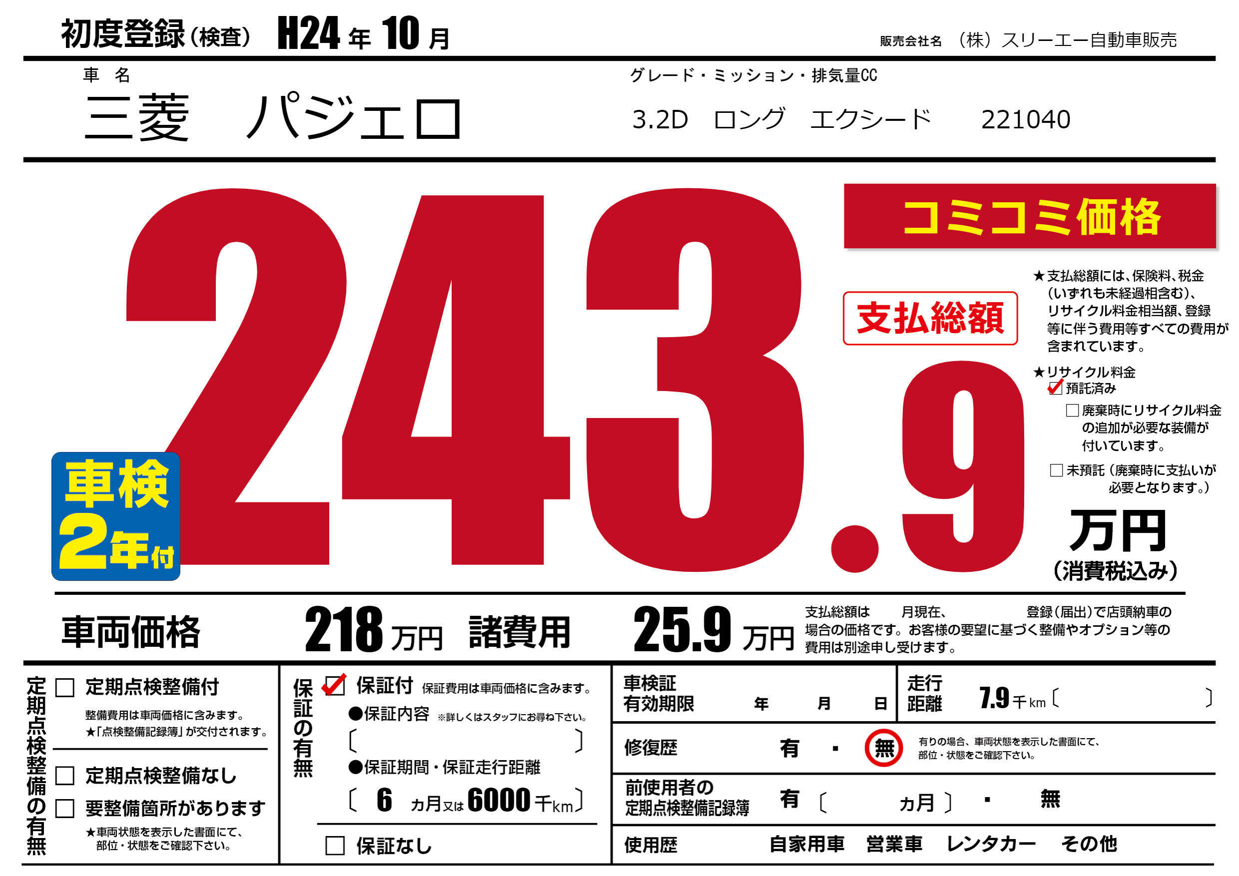 保証付き 保証内容(---) 6ヶ月または(6000)千kmまで |