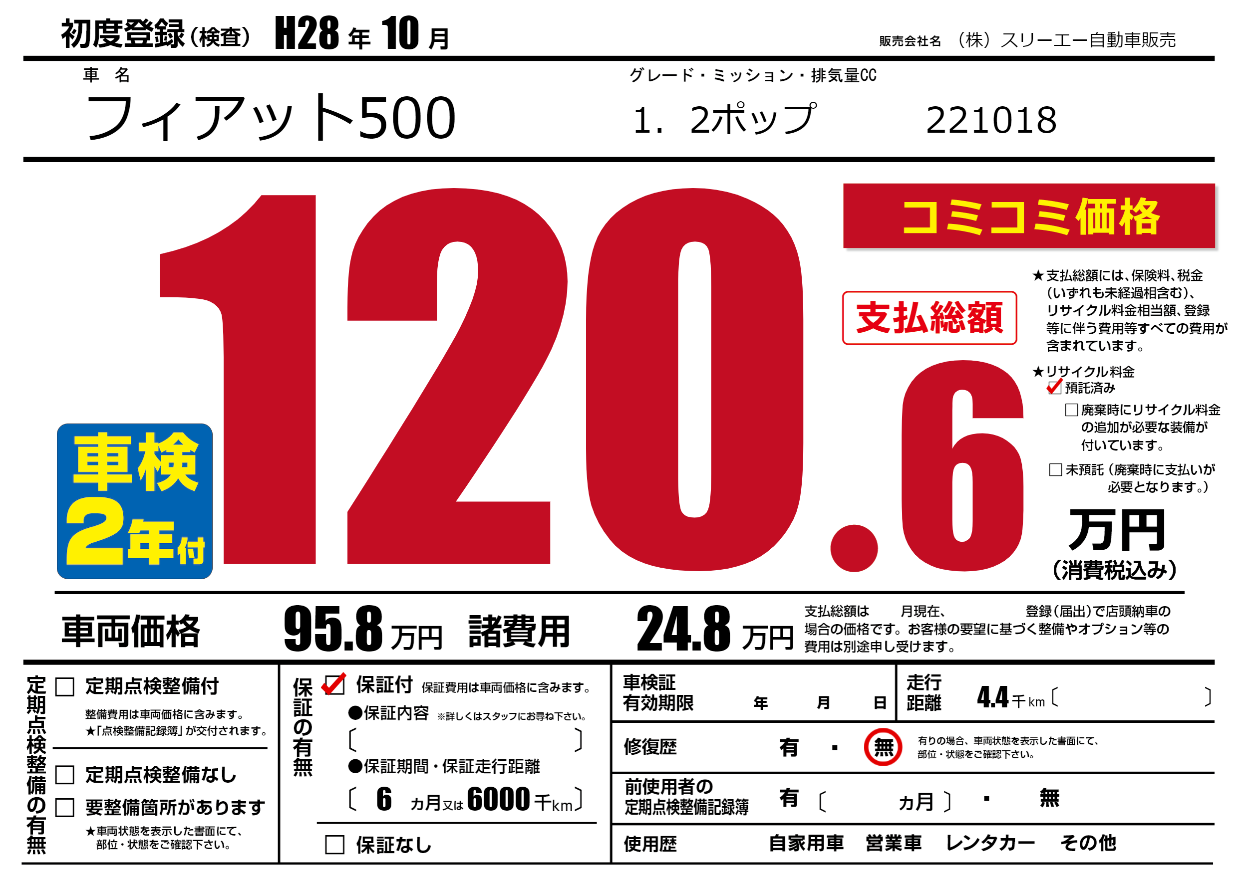 | 車名 | フィアット500 | グレード ミッション 排気量 |