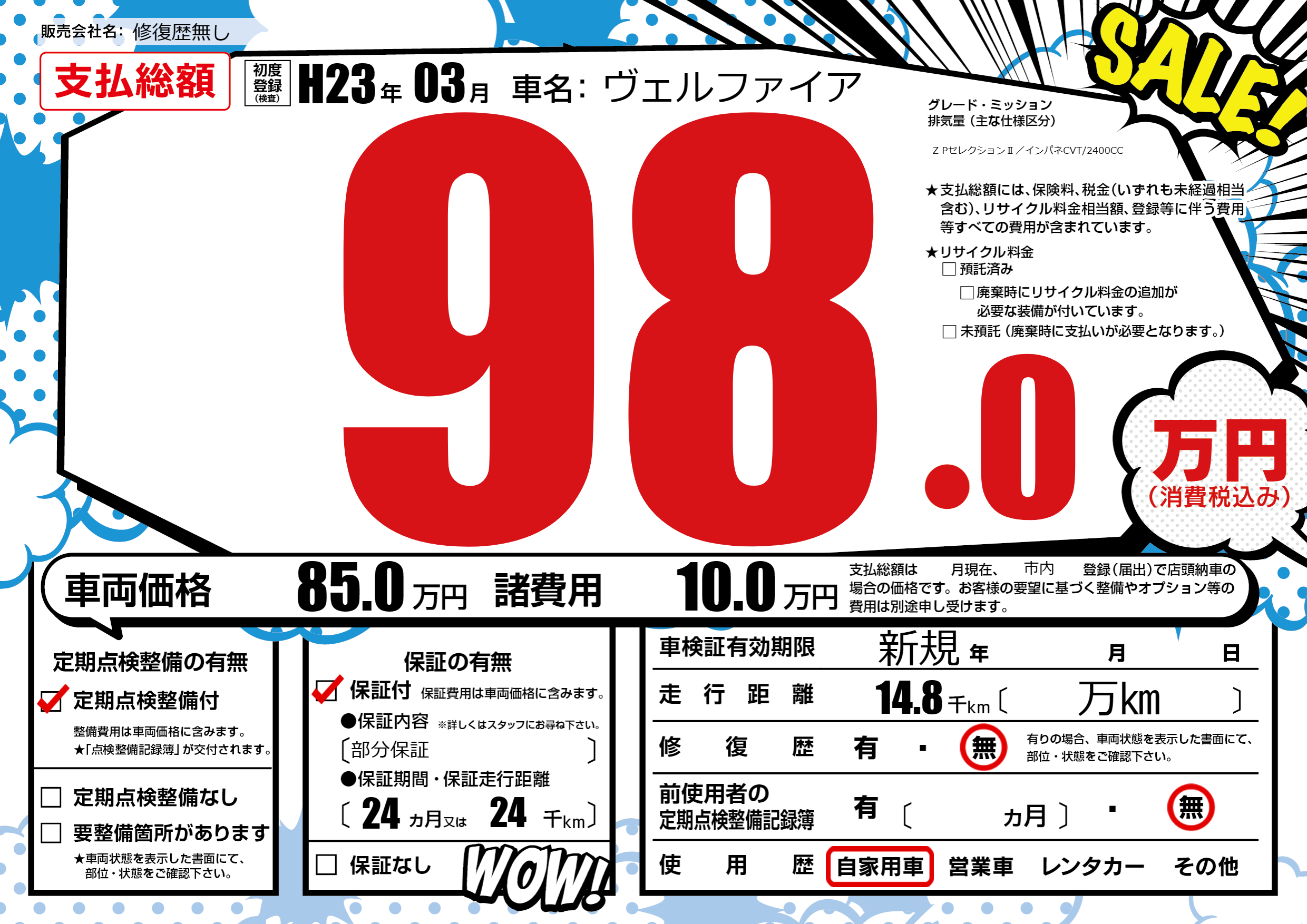 | 車名 | ヴェルファイア | グレード ミッション 排気量 |