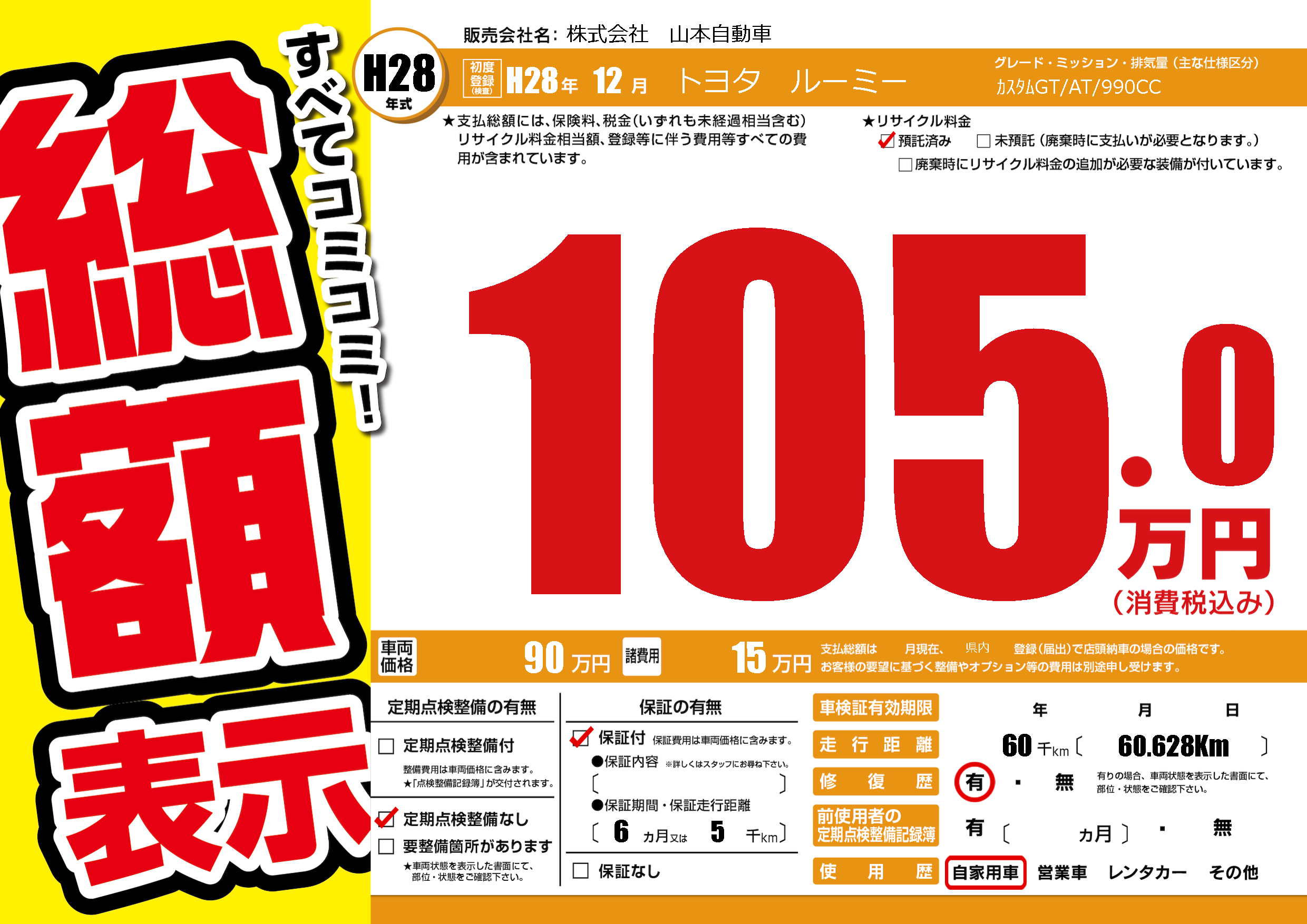 | 車名 | トヨタ ルーミー | グレード ミッション 排気量 |