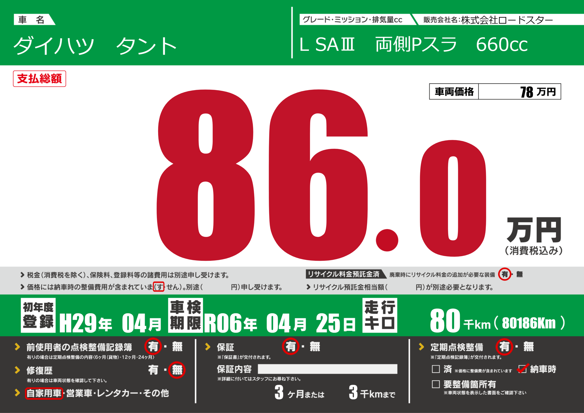 | 走行キロ | 8万km | 初年度登録 | H29年04月 |