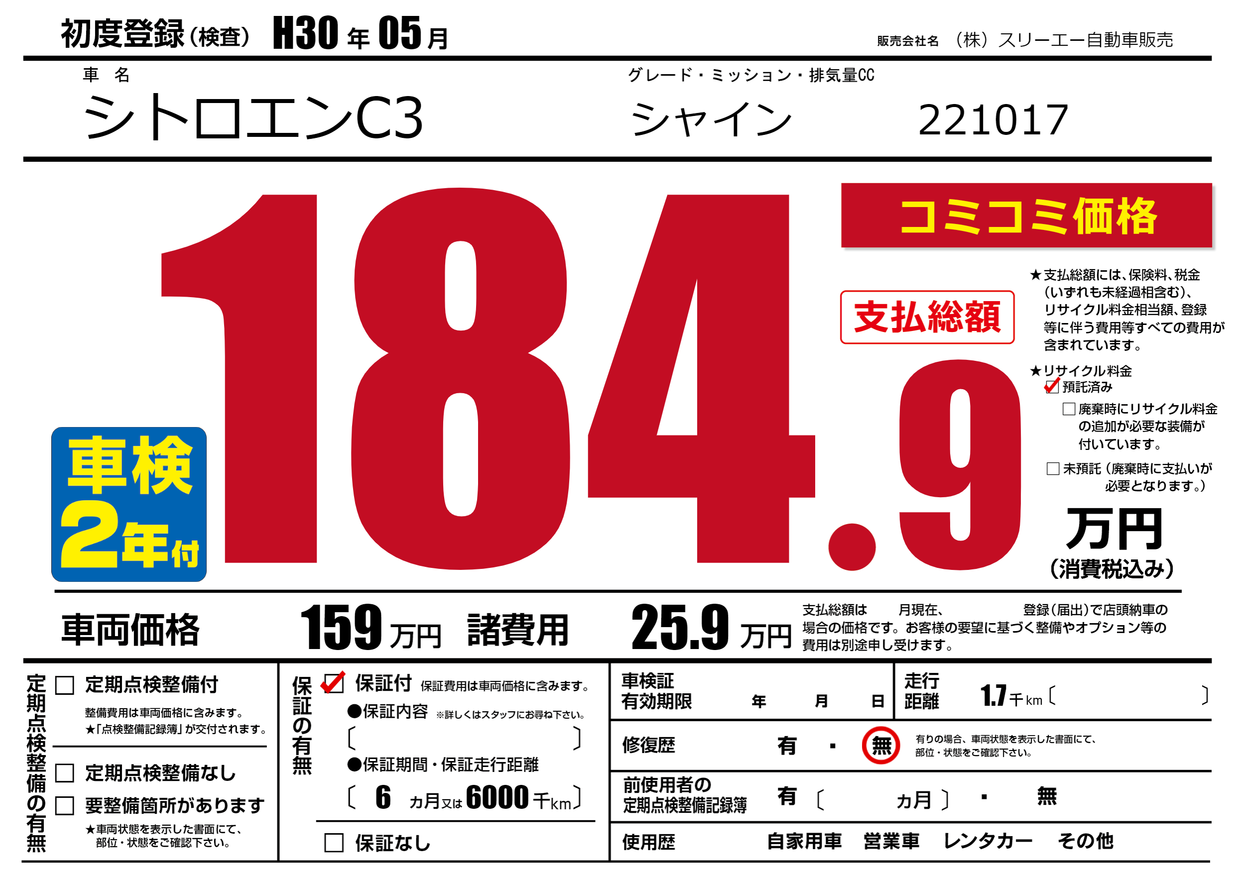 | 車名 | シトロエンC3 | グレード ミッション 排気量 |