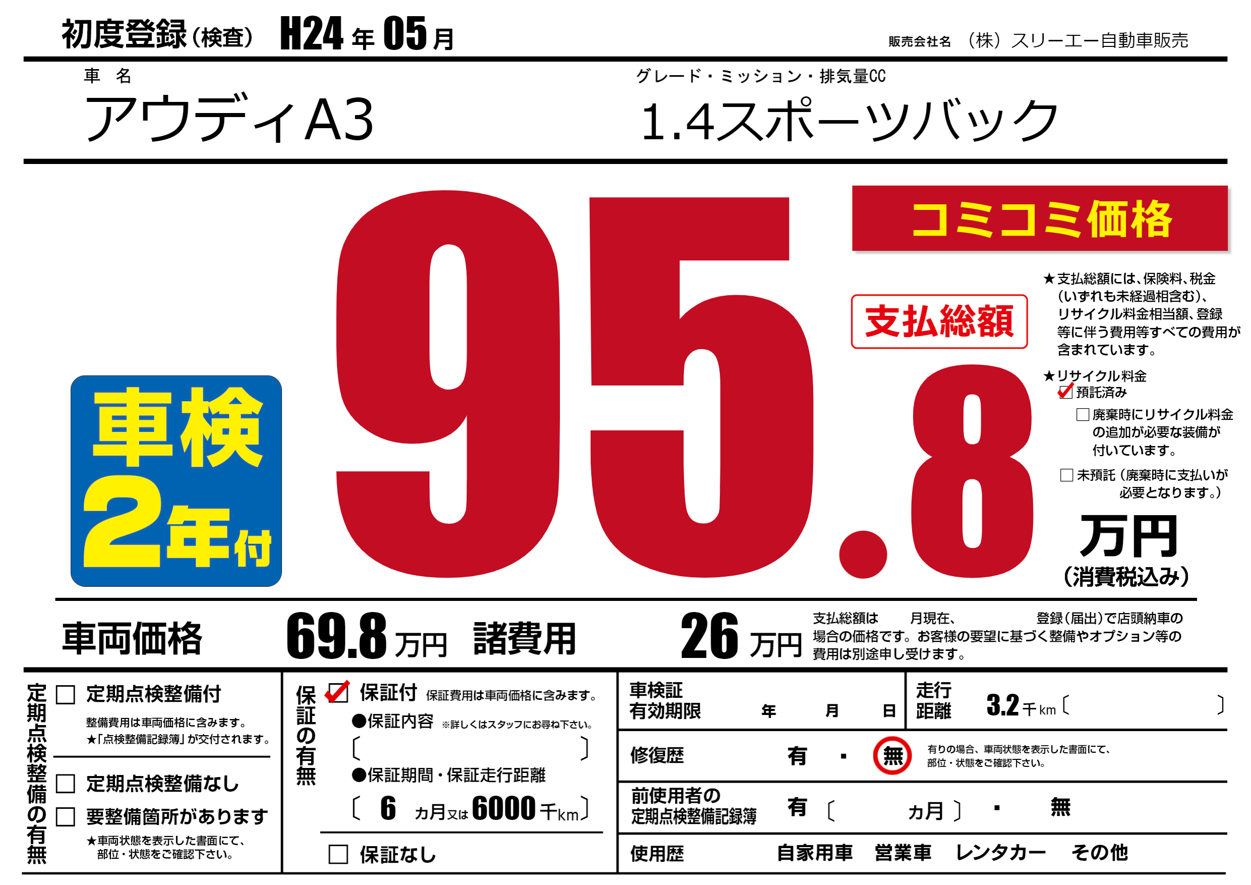 | 車名 | アウディA3 | グレード ミッション 排気量 |