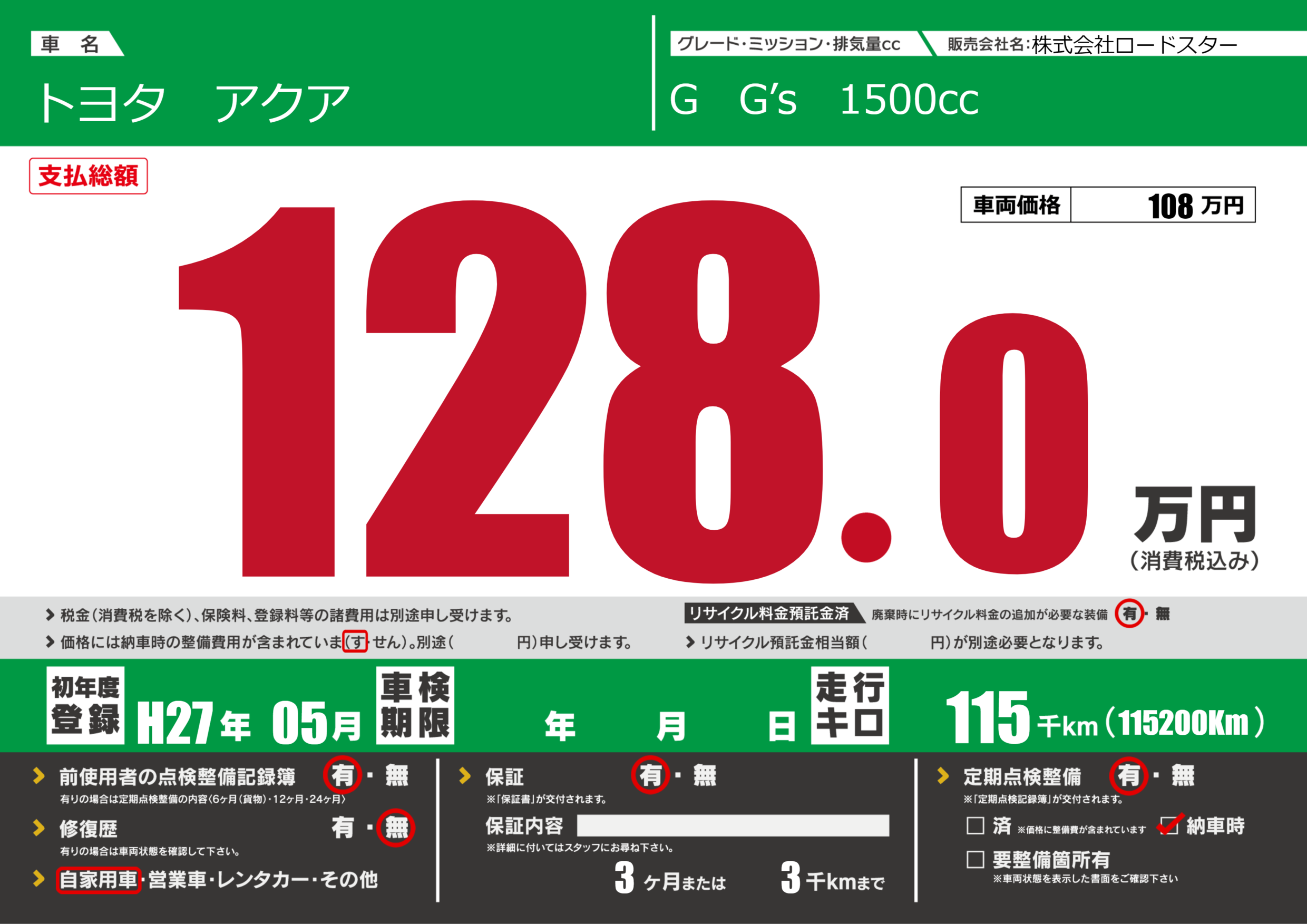 保証付き 保証内容(---) 3ヶ月または(3)千kmまで |
