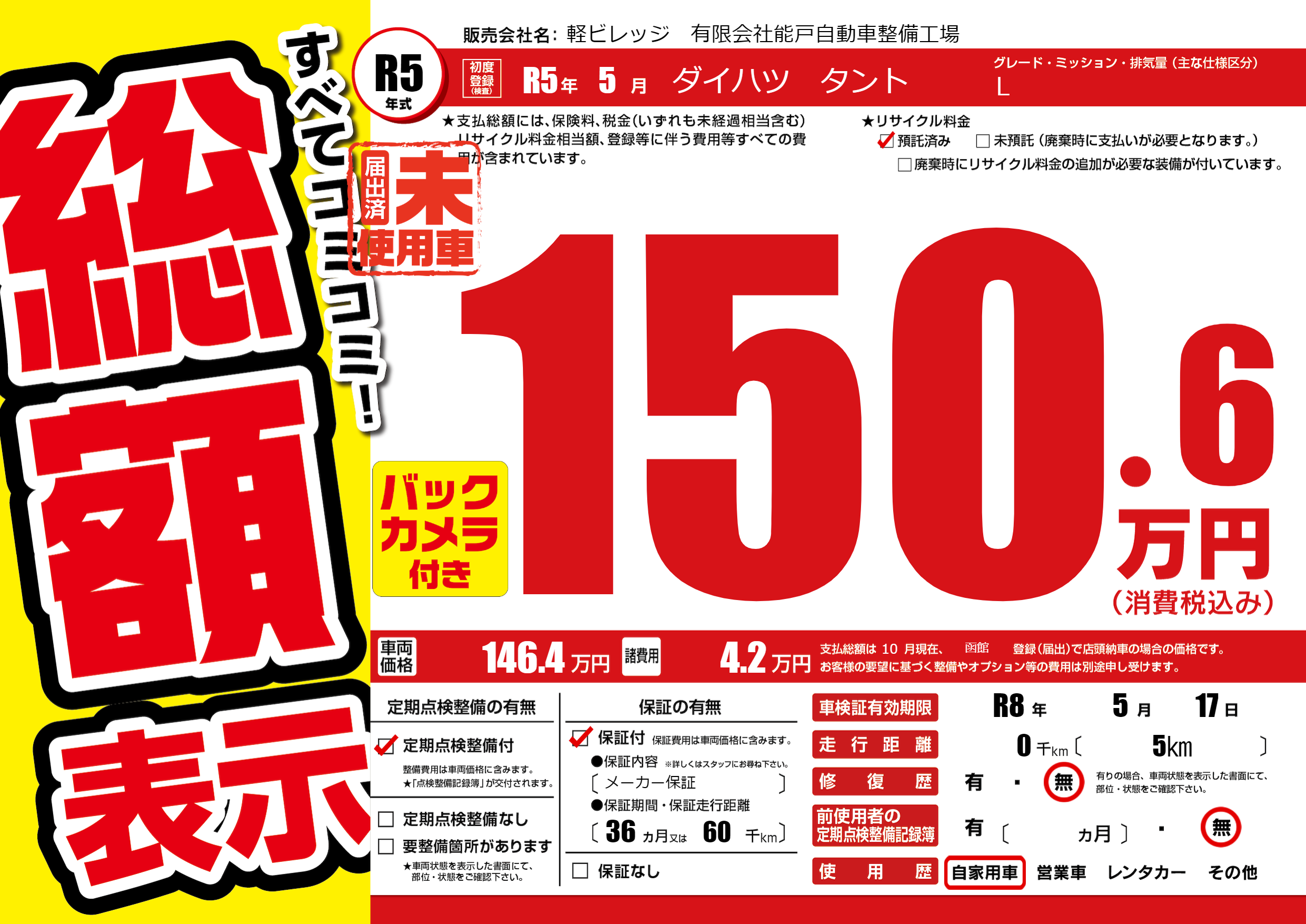 | 走行キロ | - | 初年度登録 | R5年5月 |